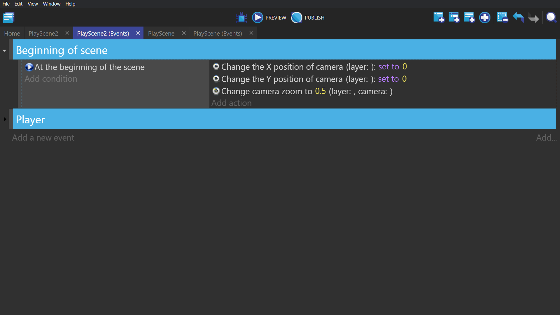 Action: - "Camera center X position" with modification sign "= (set to)" and the value 0. (Leave layer and camera number as they are) - "Camera center Y position" with modifaction sign "= (set to)" and the value 0. (Leave layer and camera number as they are) - "Change camera zoom" with a value of 0.5. (Leave layer and camera number as they are)