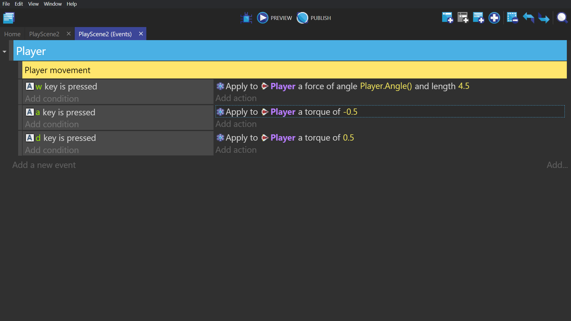 Create 2 more events, with the A/D keys being pressed as their conditions, but this time the action will be "Apply torque (rotational force)" and give them -0.5 or 0.5 based on the direction you would like them to go when either A or D is pressed.