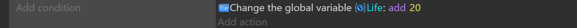 - Actions affect the objects that matched the conditions. They can change the object's position, appearance, etc...