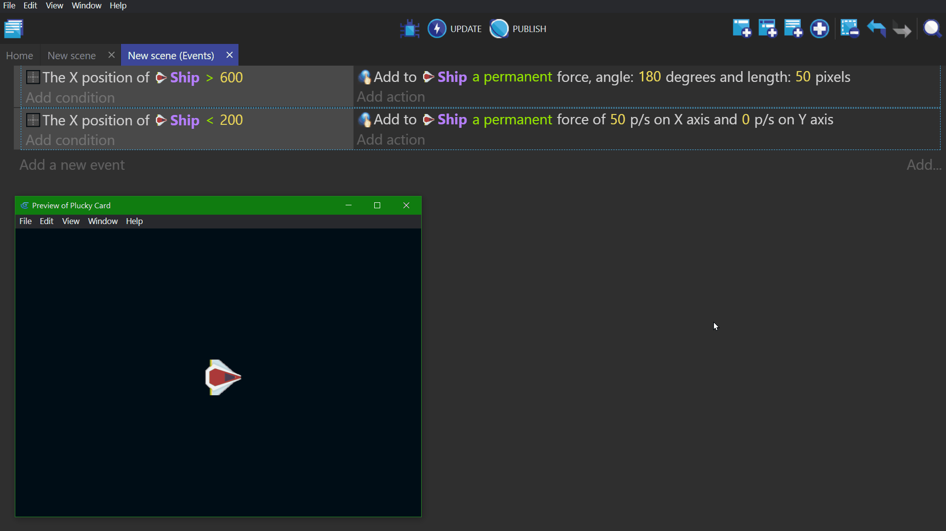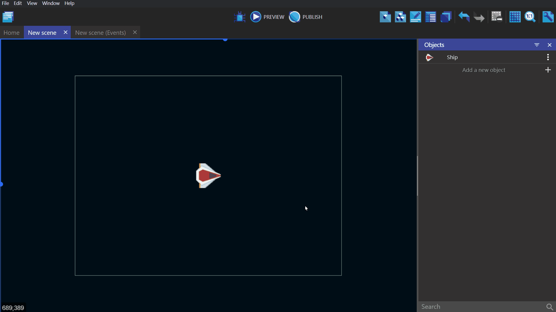 - In the bottom example, the first event deletes all the "Ship" objects from the scene/screen. It then creates one "Ship" at the coordinates X: 100, Y: 200 (100;200) on the base layer. This pair of events will display a single ship on the screen. (Behind the scenes, the ship is being deleted and recreated on every frame, which is not something you would want to do in a real game.)
