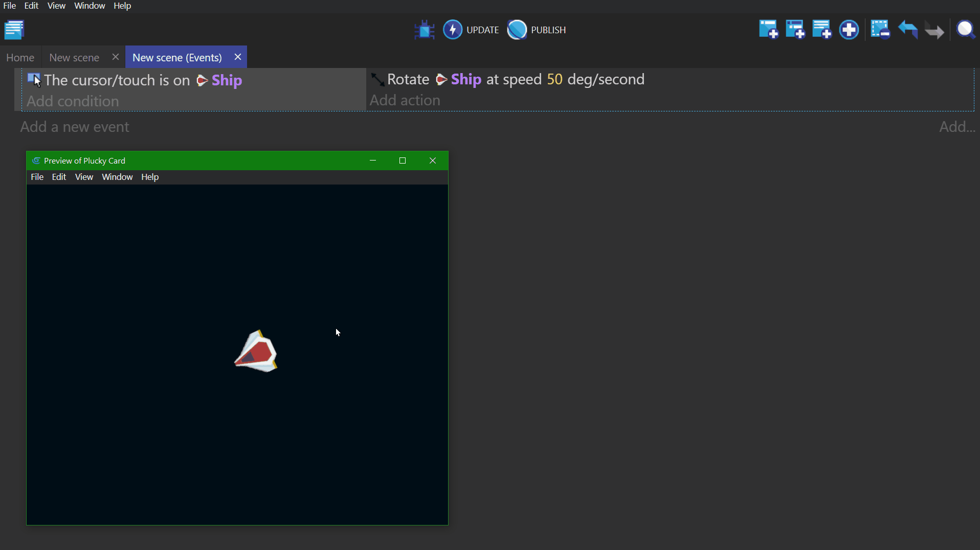 An event without any conditions will always perform the actions. In the video below, the ship object will continuously rotate at the speed set in the Rotate Ship action.