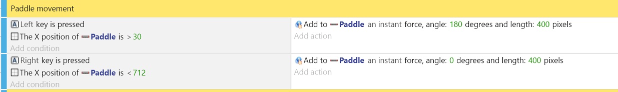 Now you need to add a corresponding action to the condition. The paddle should move left on a horizontal axis if the condition is met.