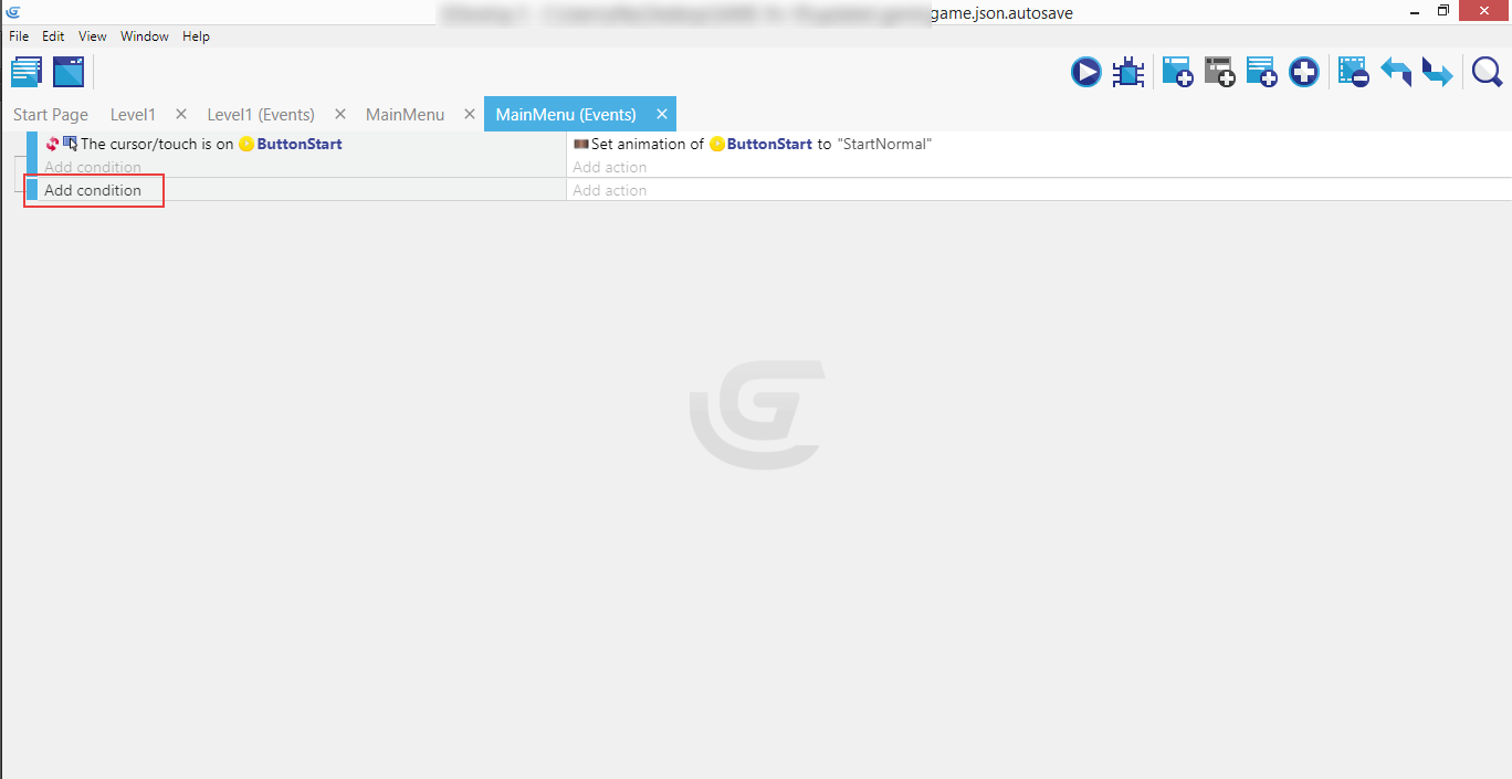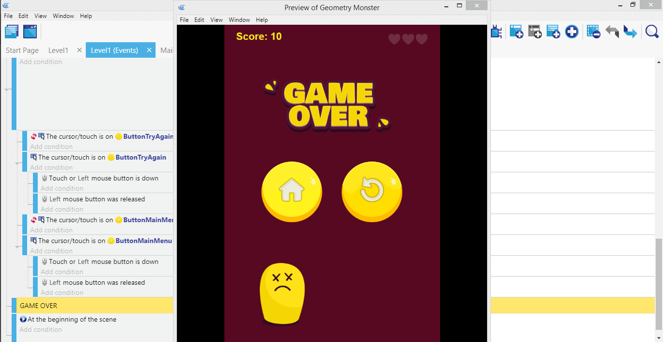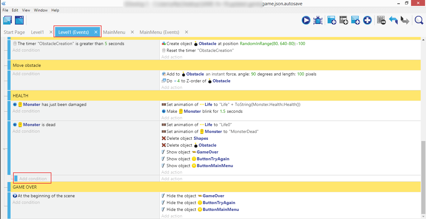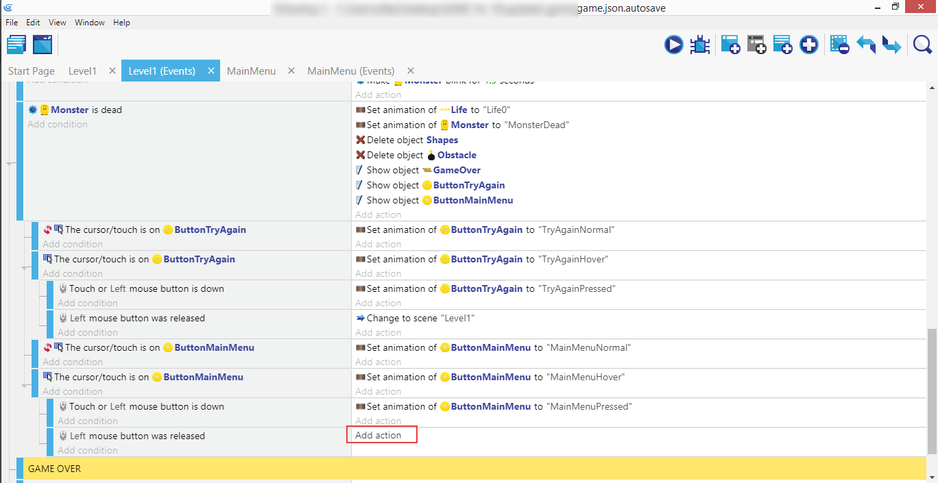 Since we now know how to switch between scenes, let's do this for the Try Again button we've created earlier on, but haven't implemented the actual action yet. Click on the "Level1 (Events)" tab, and "Add a condition".