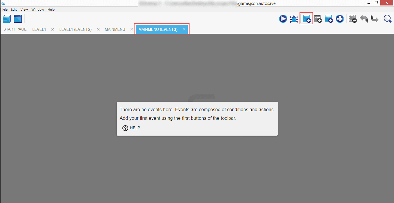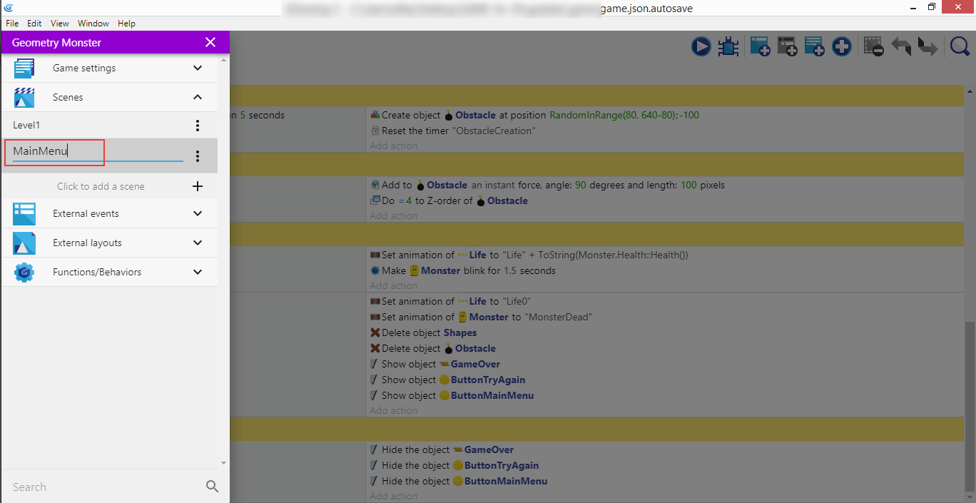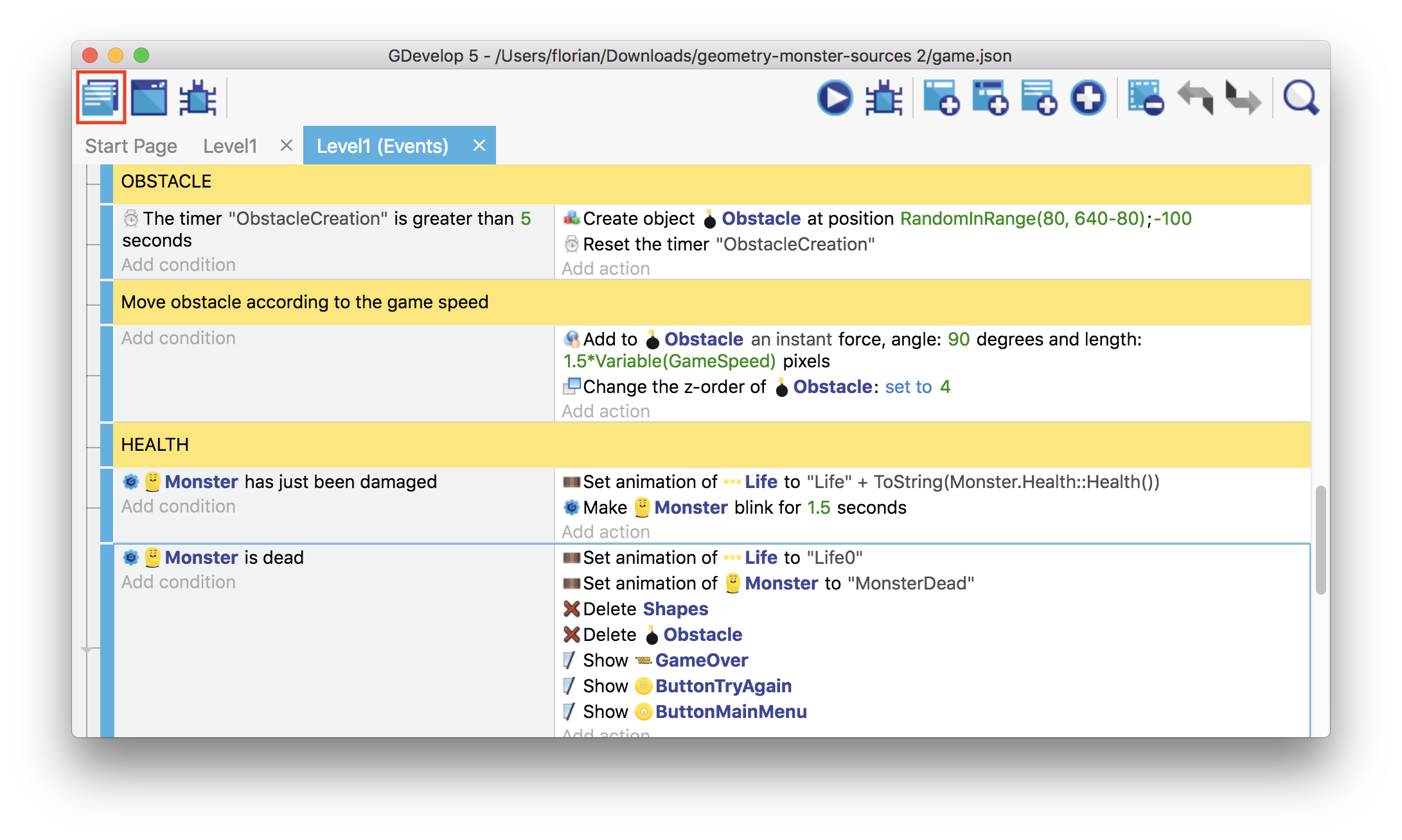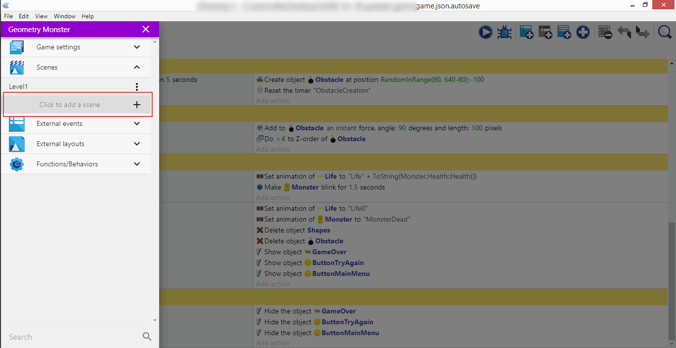 Since we now know how to switch between scenes, let's do this for the Try Again button we've created earlier on, but haven't implemented the actual action yet. Click on the "Level1 (Events)" tab, and "Add a condition".