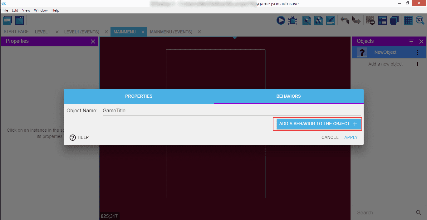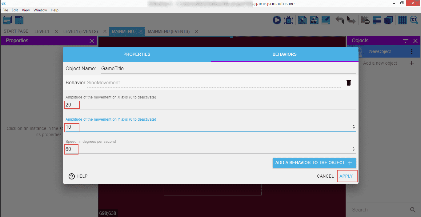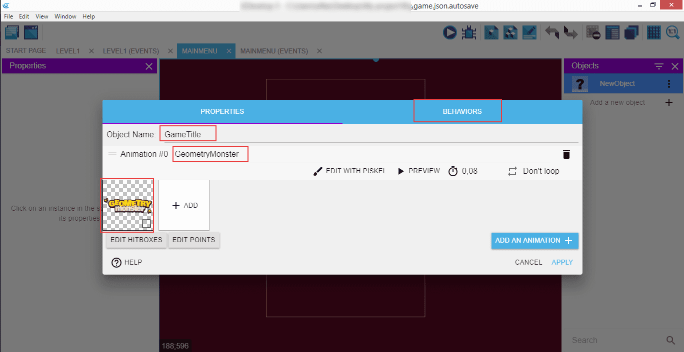 Object's name is "GameTitle", and the animation "GeometryMonster". Add the title image, and click on the "Behaviors".