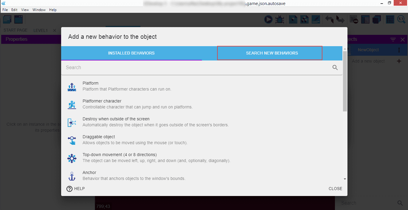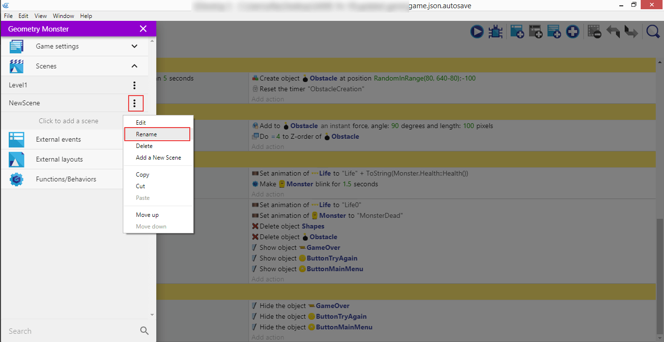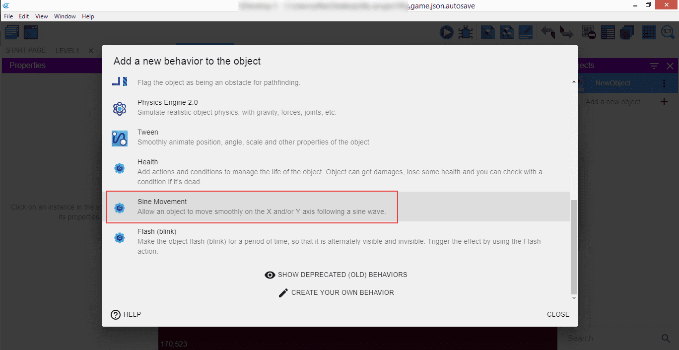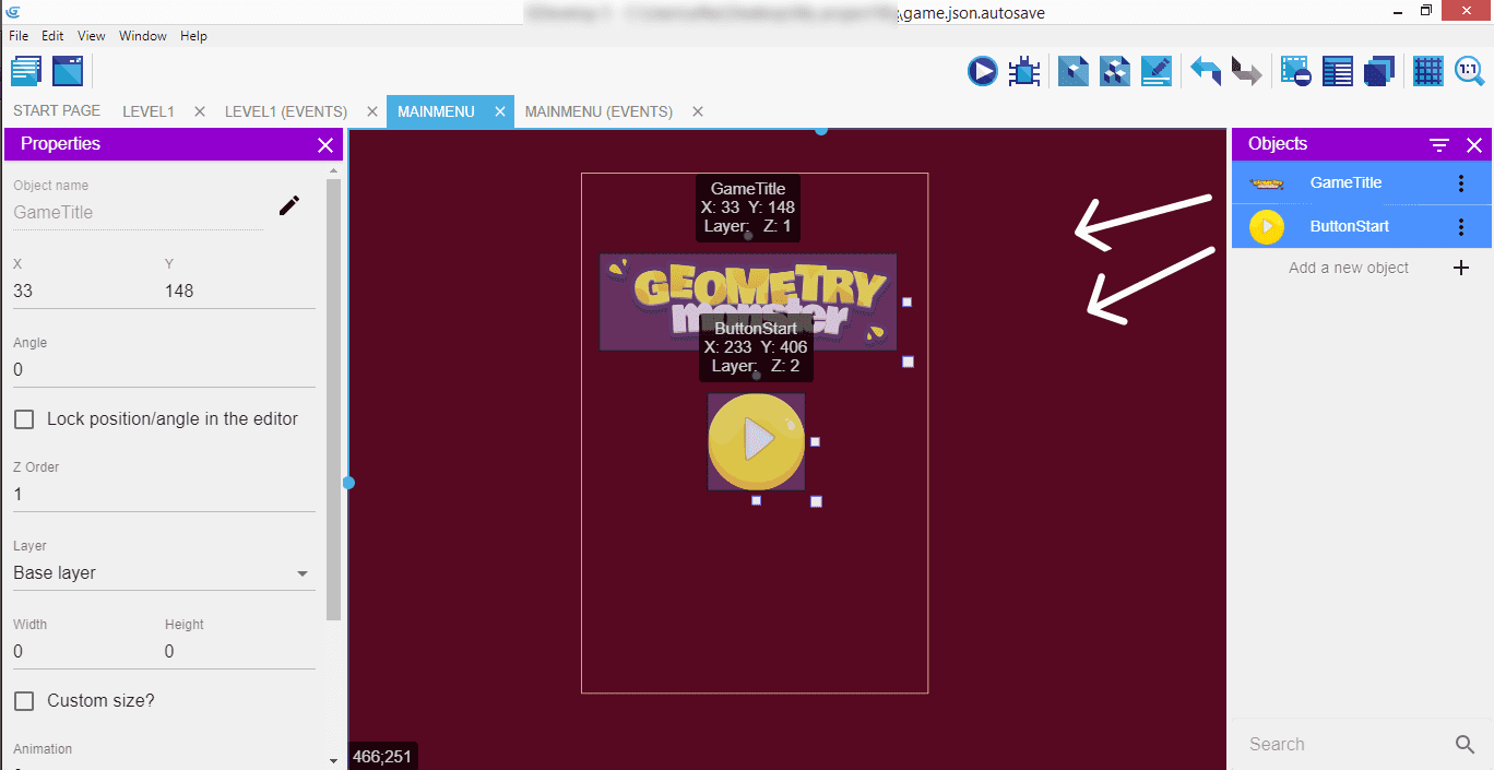 Object's name is "GameTitle", and the animation "GeometryMonster". Add the title image, and click on the "Behaviors".