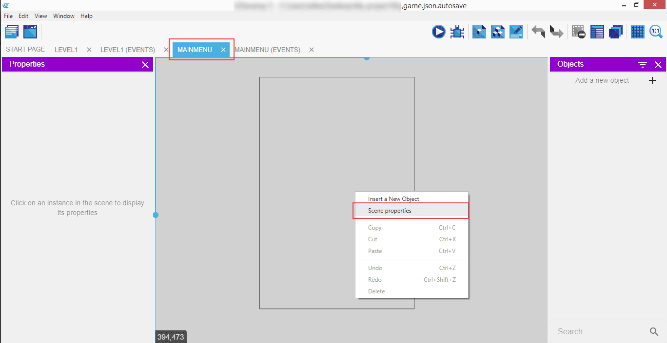 Click on the "MainMenu" tab, then right click on the scene, and select "Scene properties".