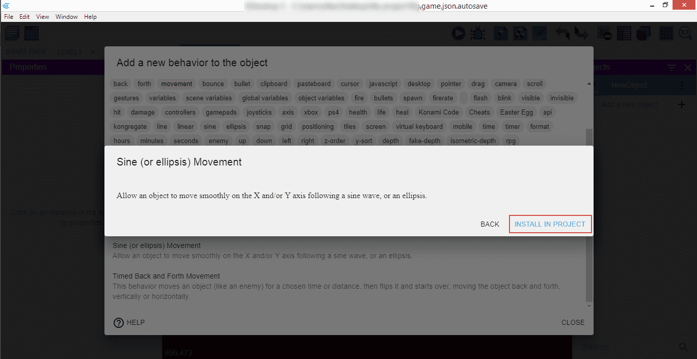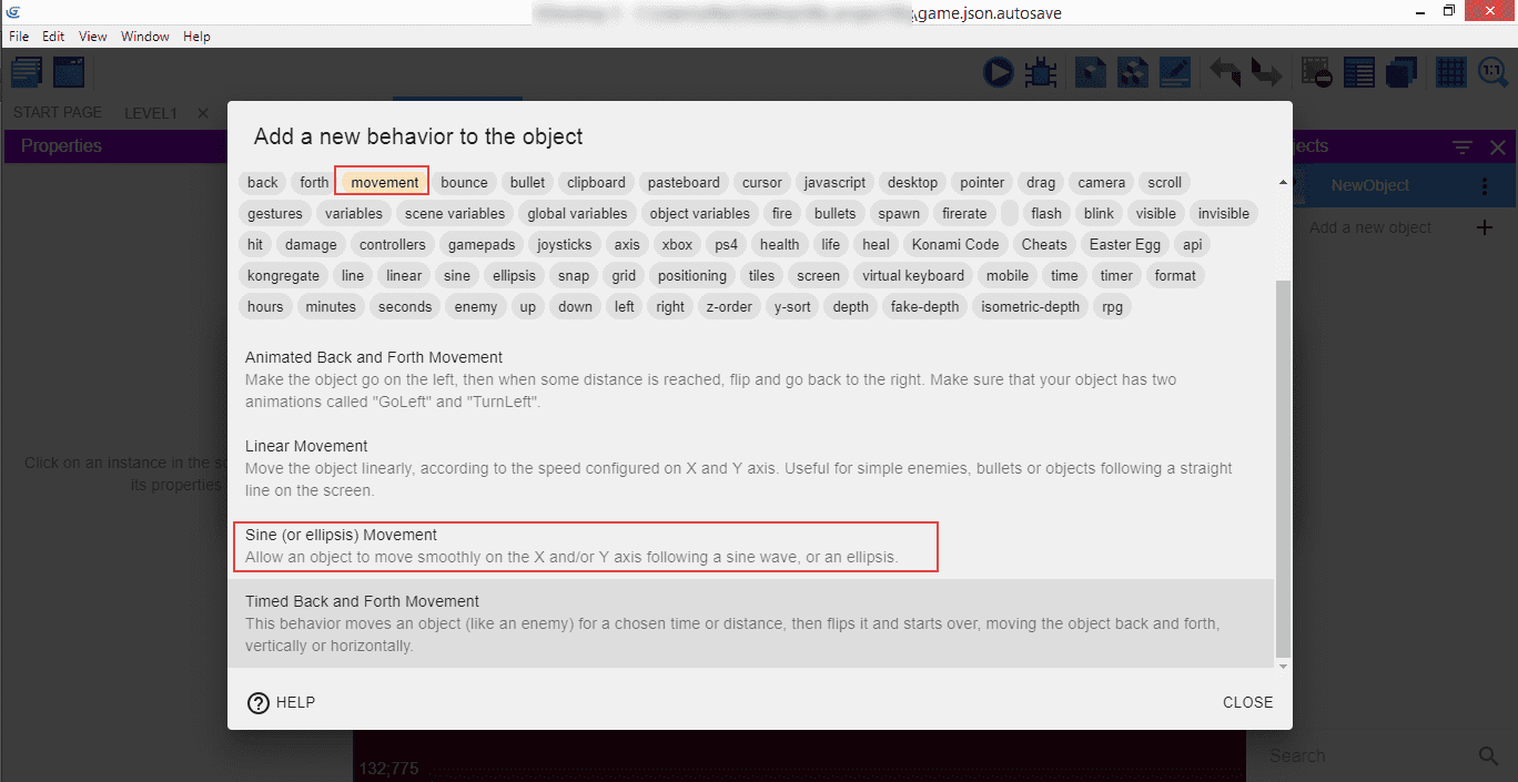 And find "movement". We will use the "Sine (or ellipsis) movement" to animate the title image, so it's not a static one and the whole main menu will look better.
