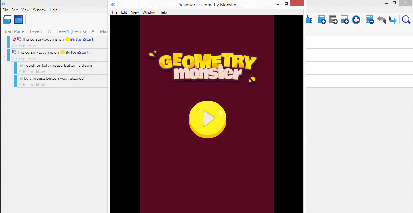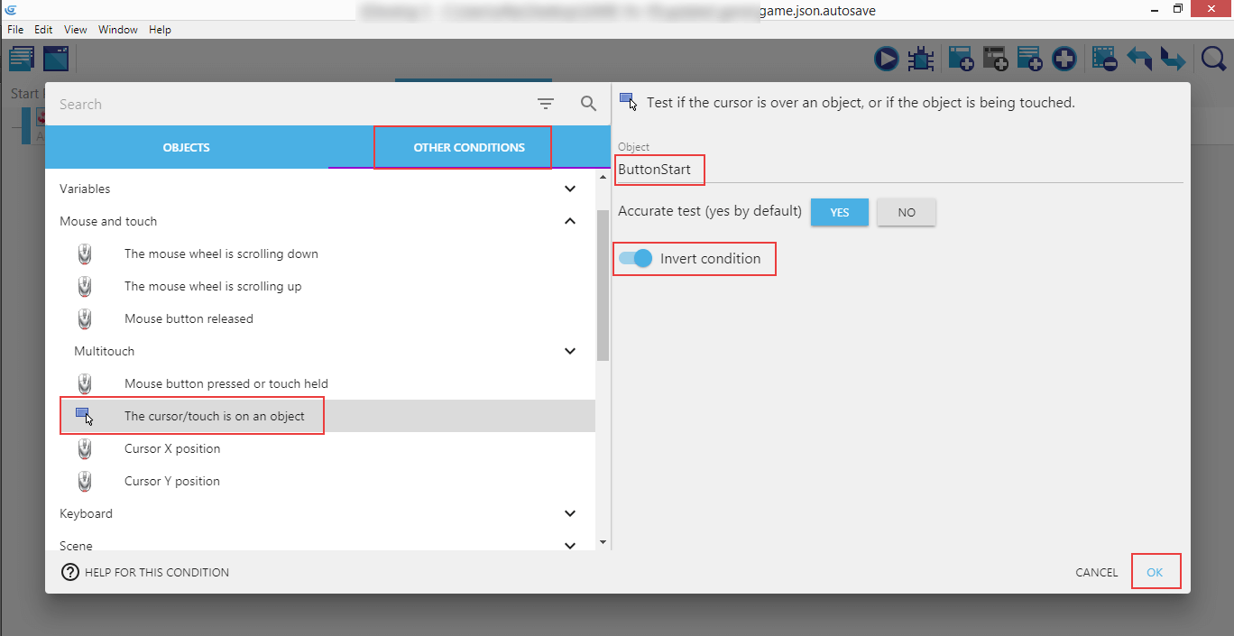 Add a new condition: "Other conditions", then "The cursor/touch is on an object", and assign this to "ButtonStart". Don't forget to select "Invert condition" to make this work as we want it.