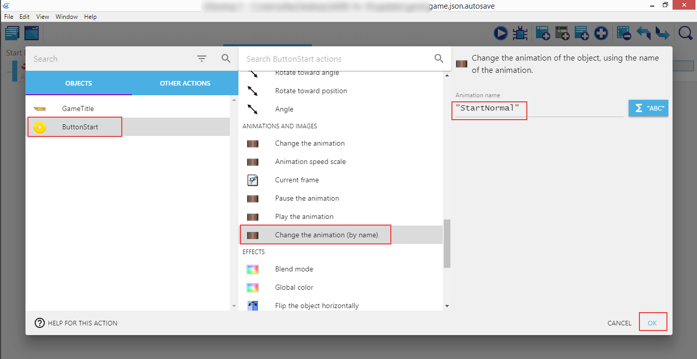 Let's add the animations to that button. Select it in the left panel, click "Change the animation (by name)" in the middle one, and enter "StartNormal" in the right panel.