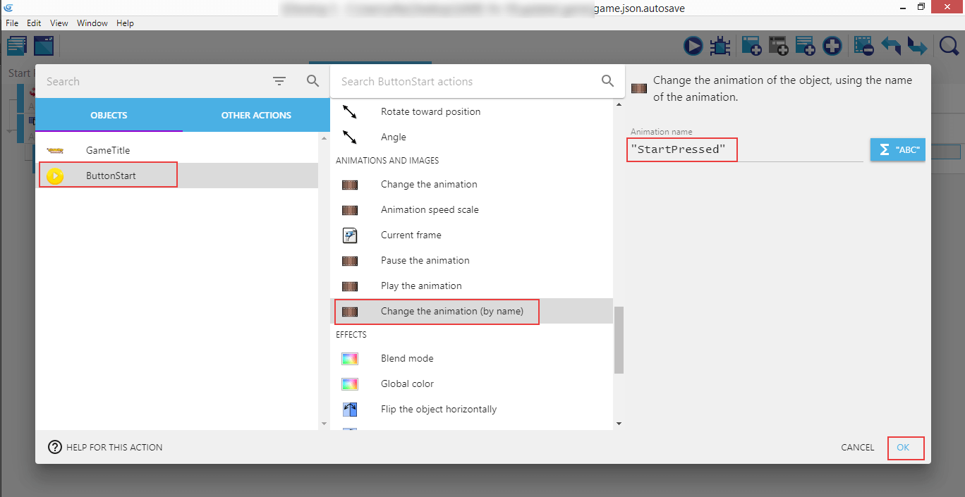 Now "ButtonStart", "Change the animation (by name)", "StartPressed"...