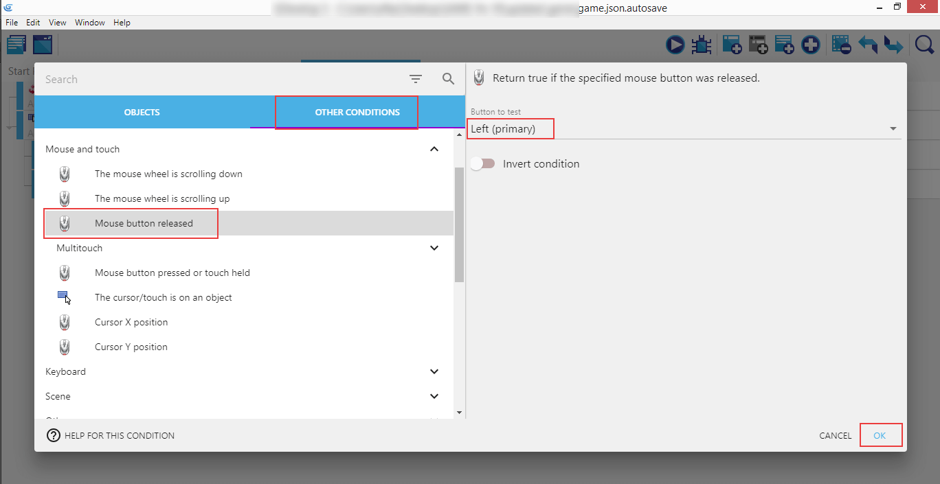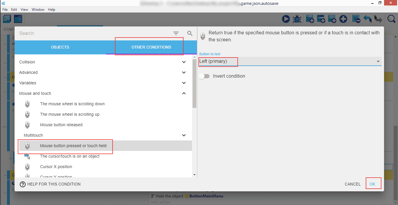 "Other conditions", "Mouse button pressed or touch held", "Left (primary)".