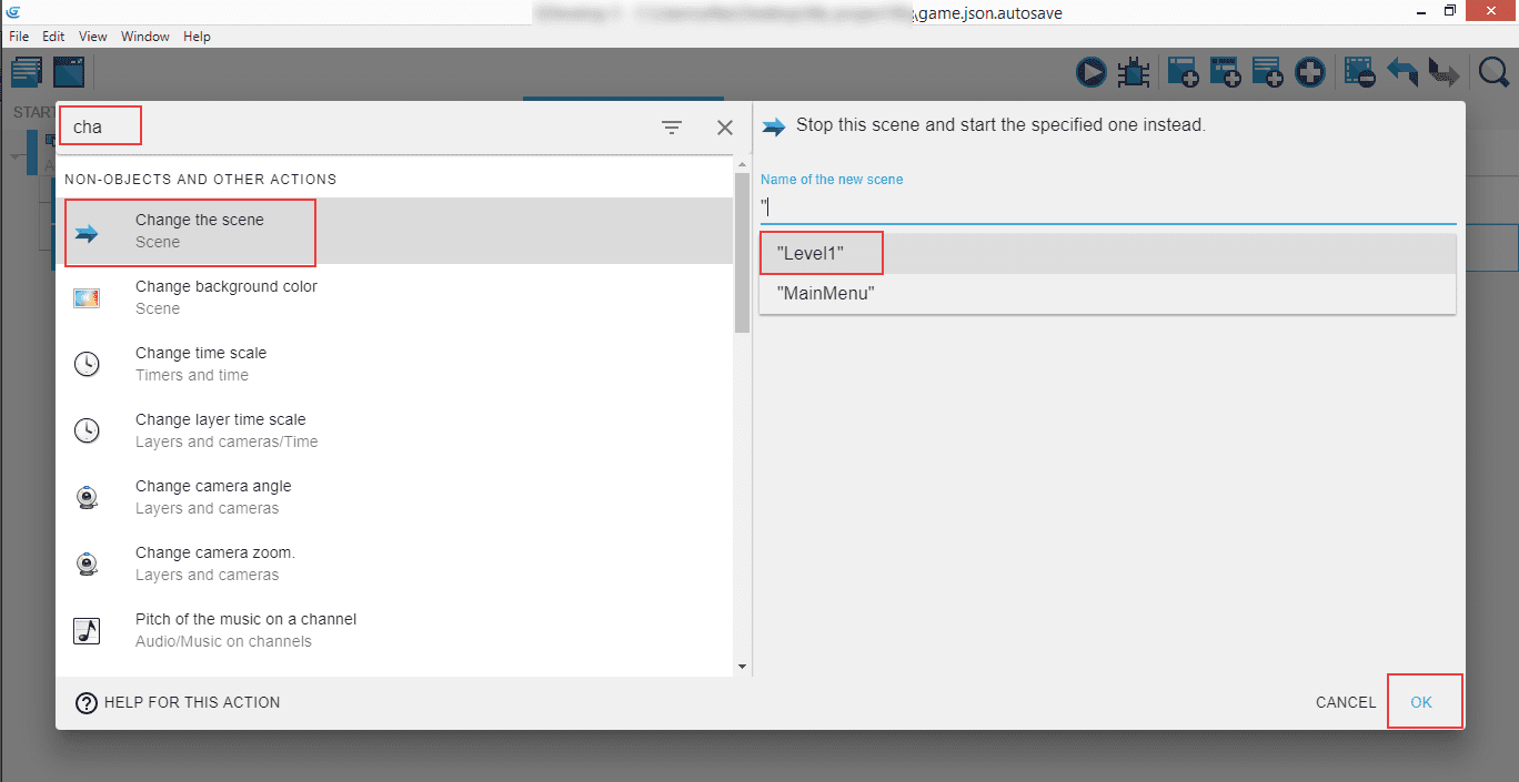 The action this button is going to perform is changing the scene to the actual game. Search for "Change the scene", then select "Level1".