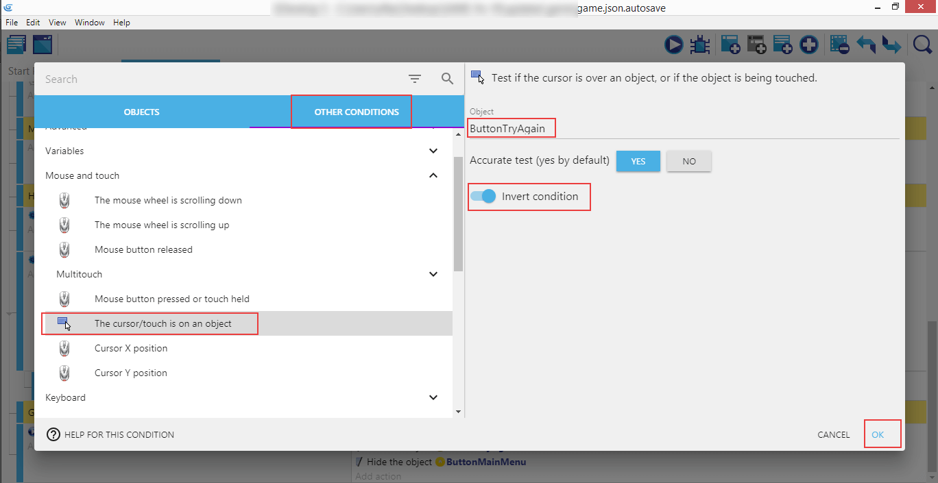 "Other conditions", "The cursor/touch is on an object", then "ButtonTryAgain", "Invert condition", "Ok".