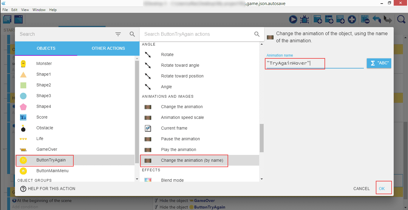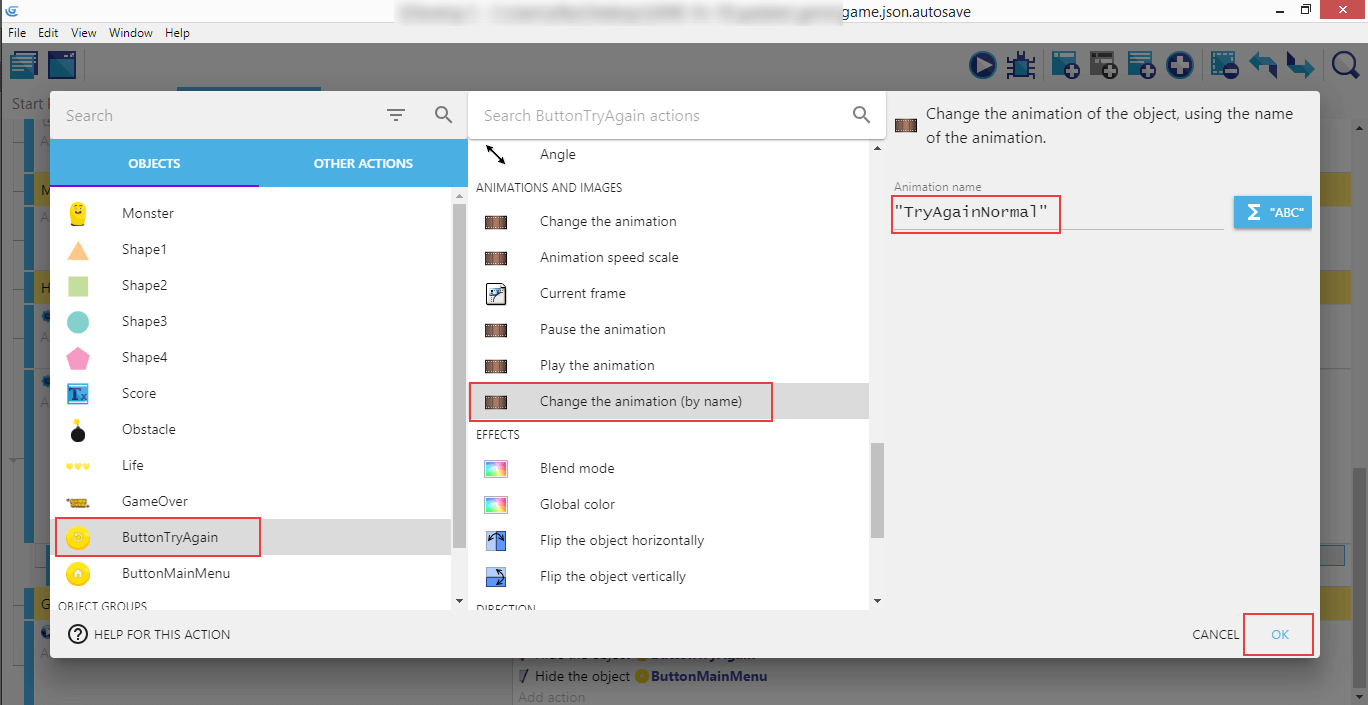 Now an action: "ButtonTryAgain", "Change the animation", "TryAgainNormal".