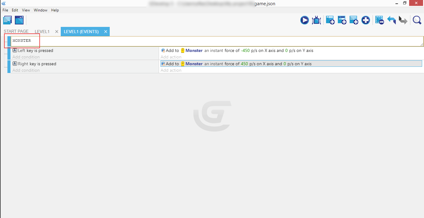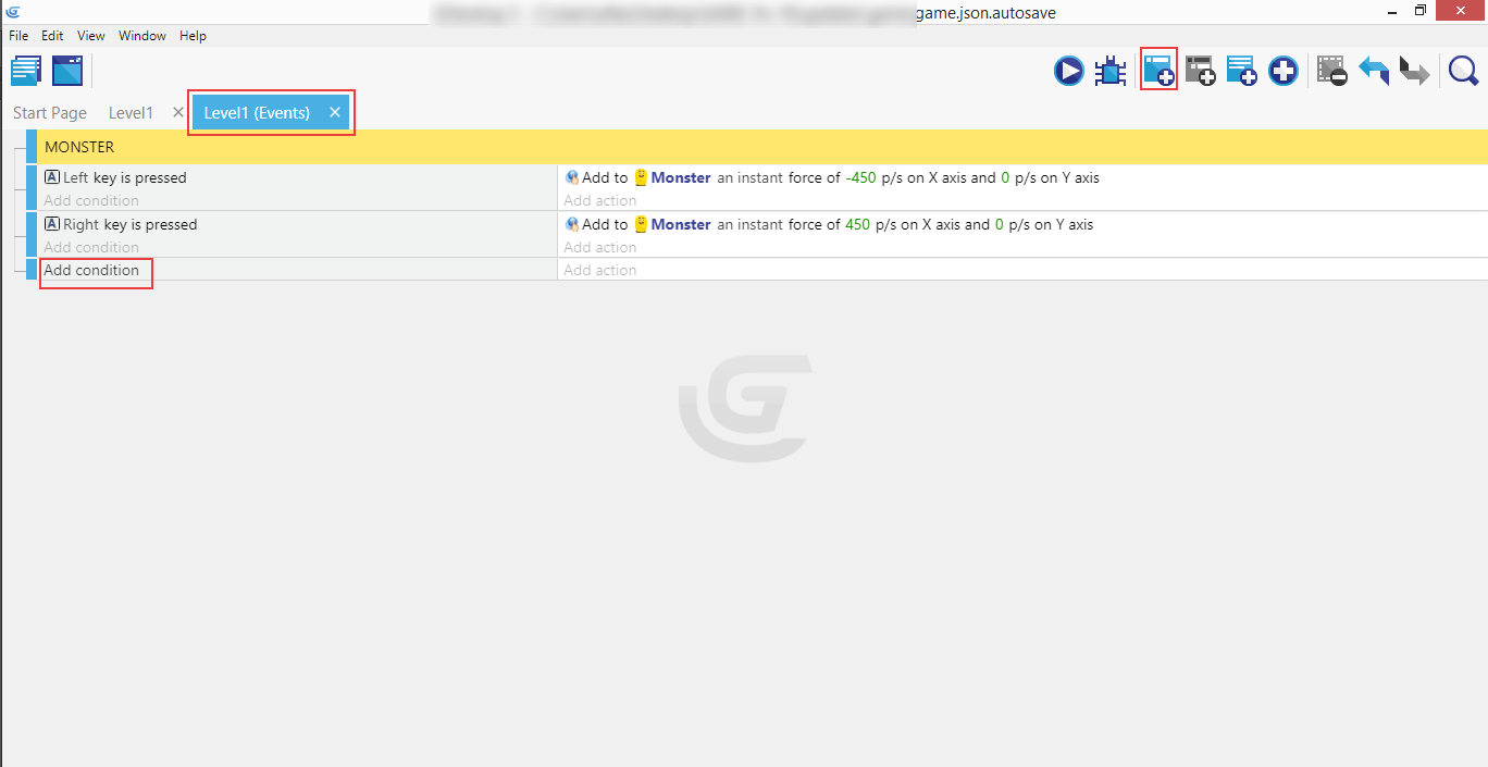 Drag the Monster from the right panel containing the objects onto the scene and click on the "Level1 (Events)" tab.