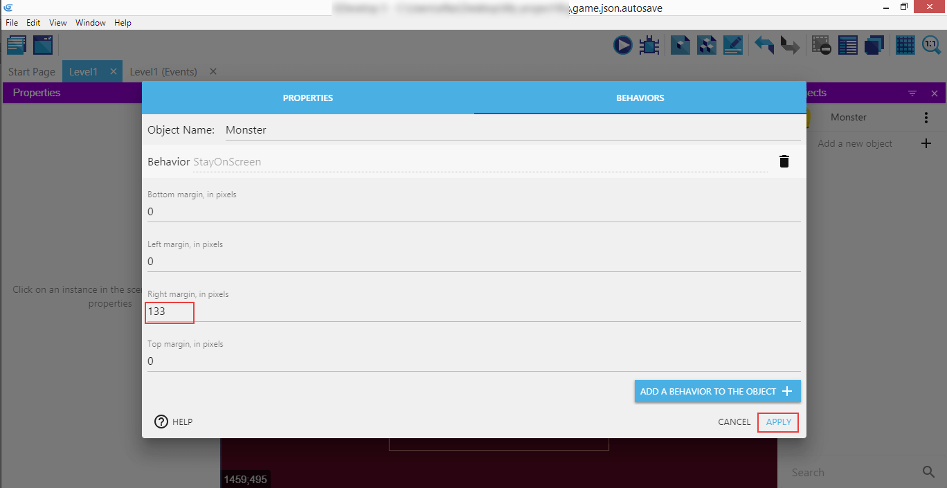as the right margin, since this is the width of the Monster, to limit him going out of the screen to the right (since his origin is in the top left part of the sprite), and then click Apply.