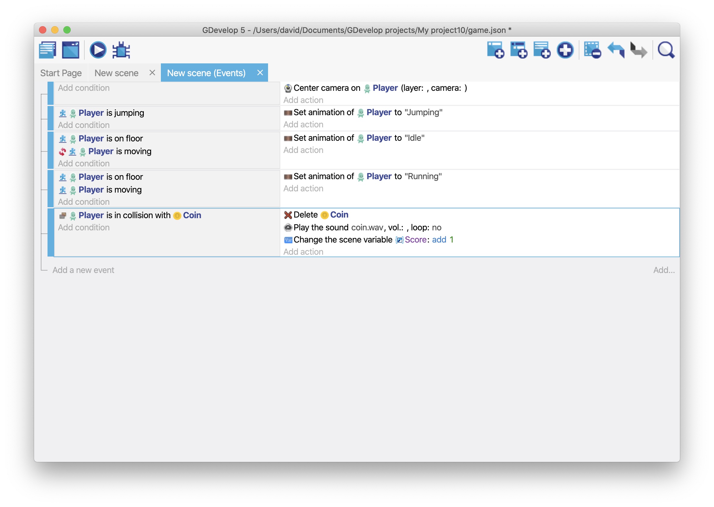 - Add a Collision condition to the event that checks if the "Player" object has collided with the "Coin" object.