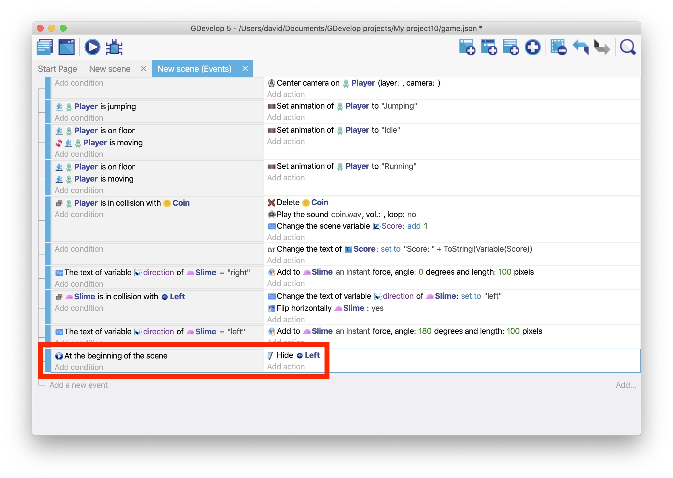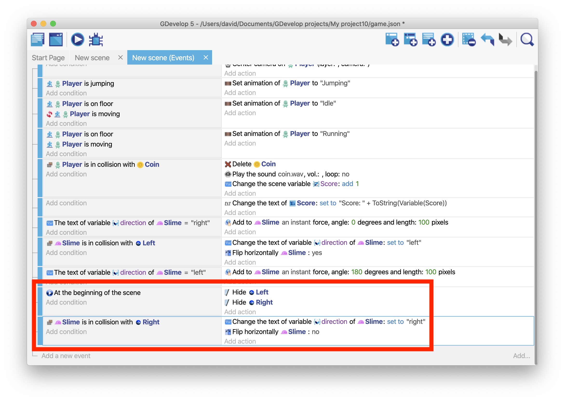 - Add a Collision condition that checks if the "Slime" object is colliding with the "Left" object.
