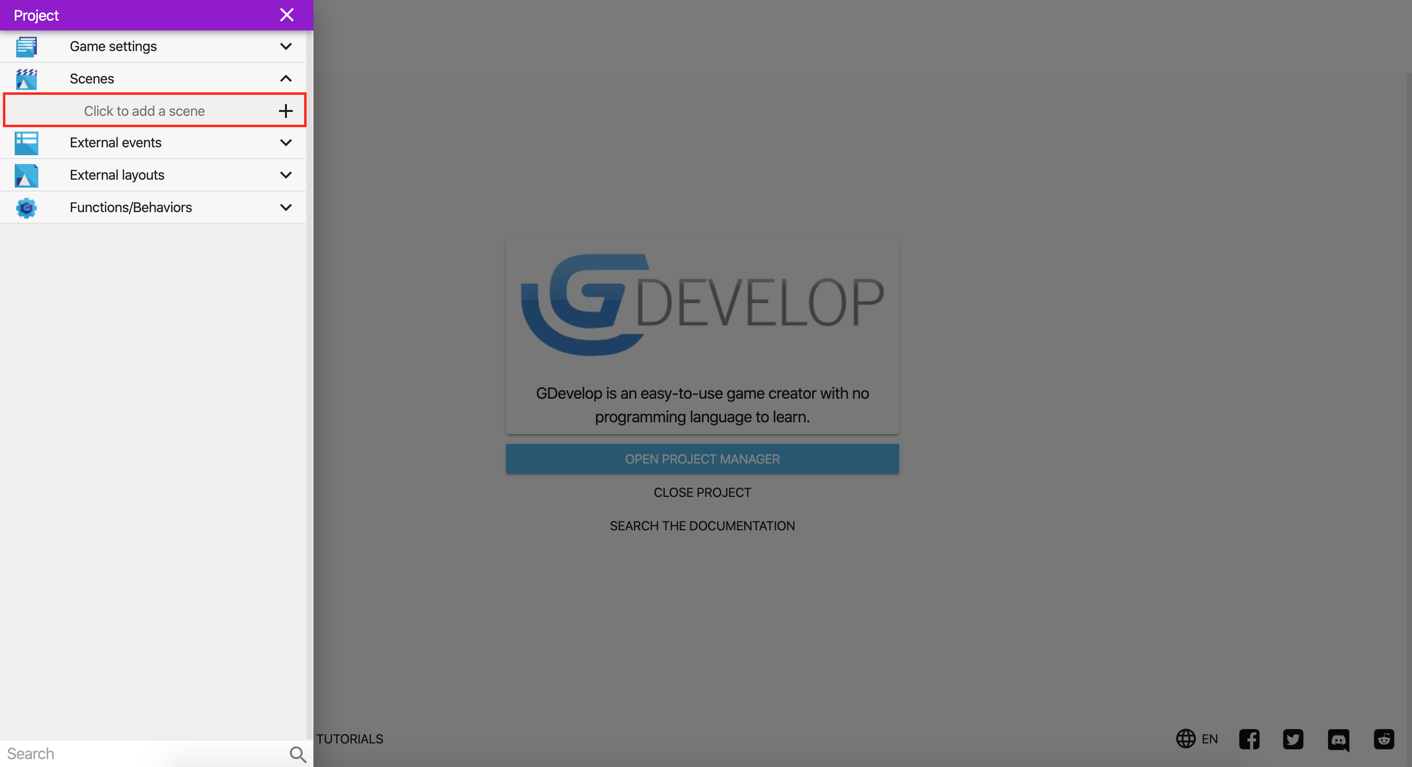 To add a scene, you should select the Scenes section on the left panel and a Click to add a scene button.
