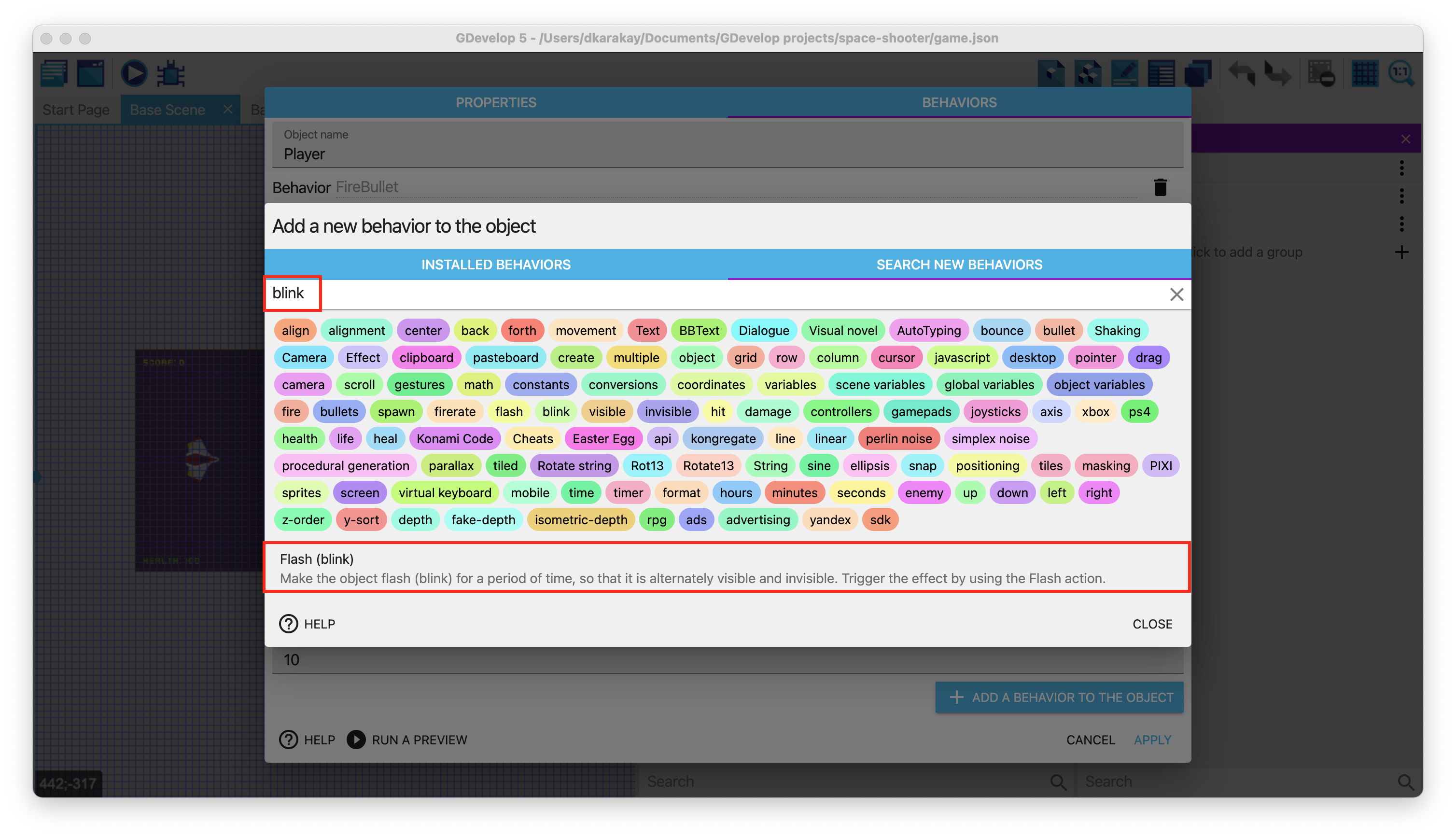 We will use a blinking effect for the player when the player gets damaged. In GDevelop, there is a behavior for blinking, so go to the player's behavior settings. Then search "blink" to install the action called Flash.