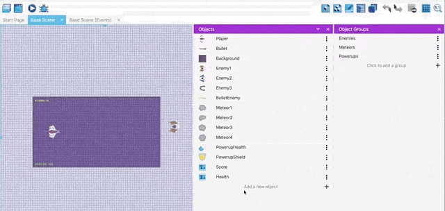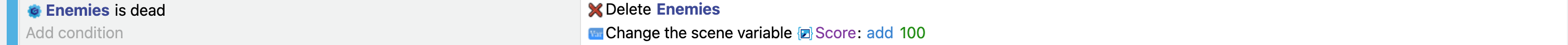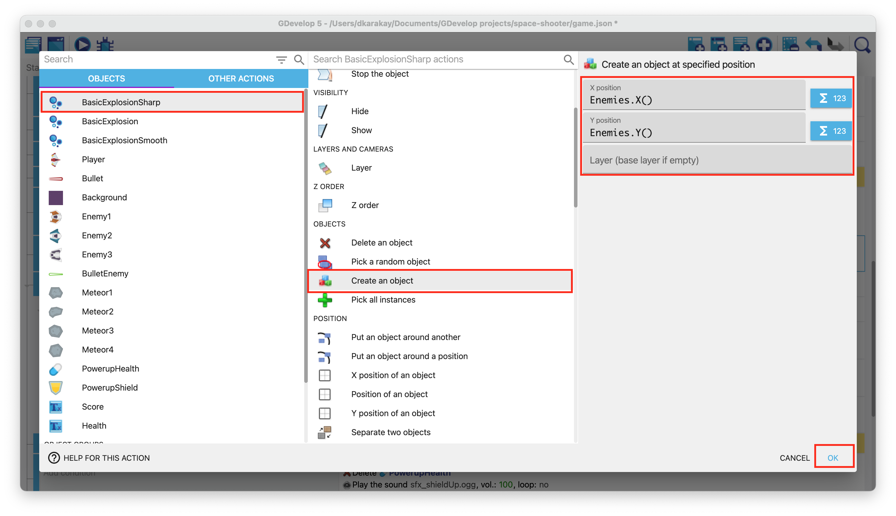 Add a new action to create these explosion objects. Select BasicExplosionSharp and choose create an object. Fill X position with Enemies.X() and Y position with Enemies.Y().