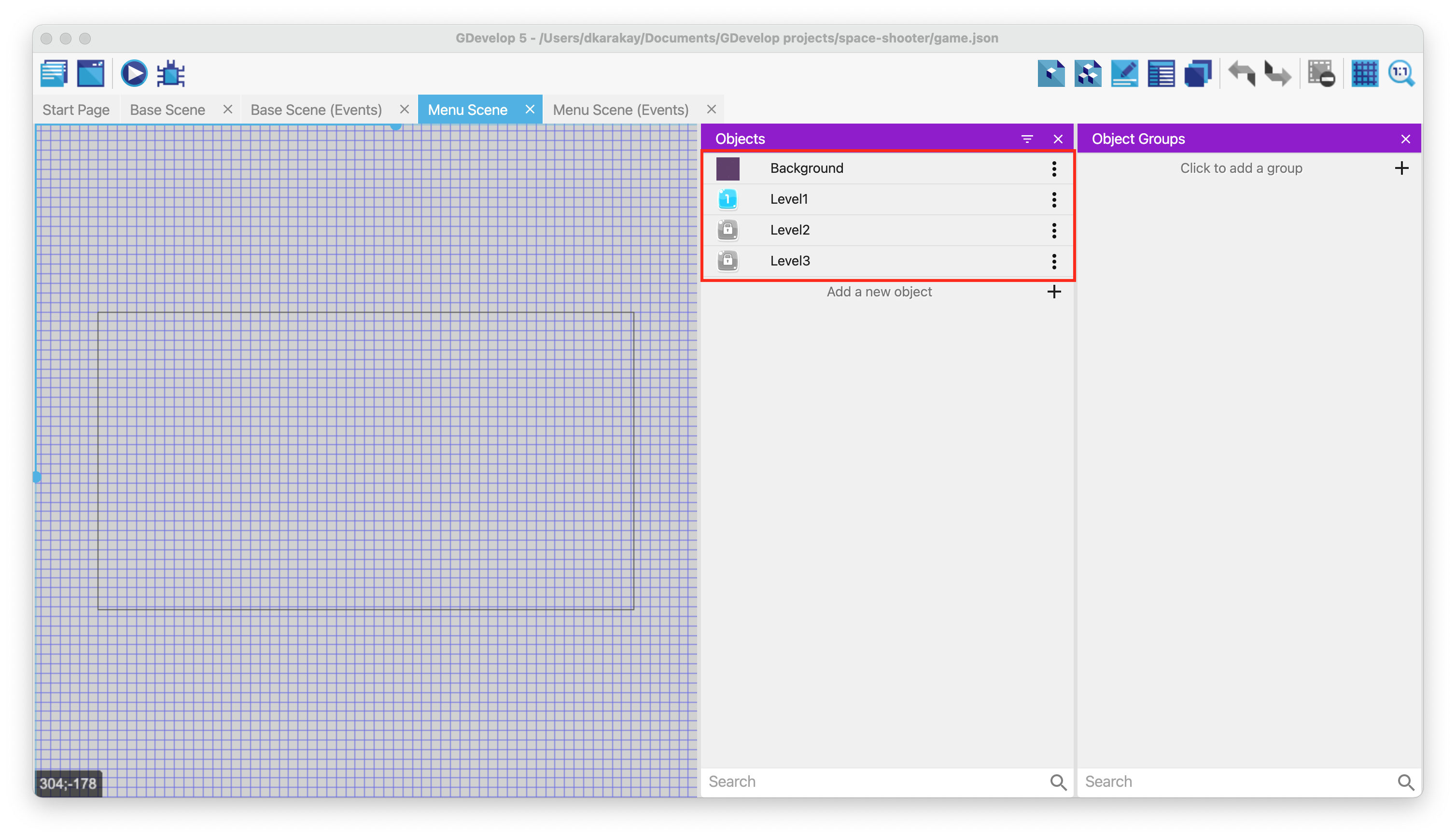 Repeat the last process to add Level3. Then, copy the Background object from Base Scene, as we did in chapter 11 to create explosion effects. In the end, your objects should look like this: