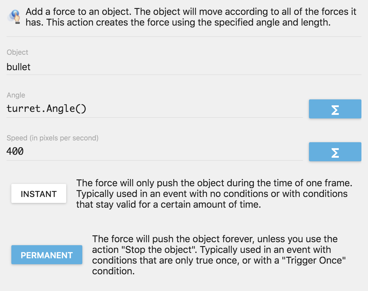 For the "Angle of movement", we'll put the same angle as the turret. Enter "turret.Angle()" in the 2nd parameter. For the 3rd parameter, enter "400". The bullet will move with a speed of 400 pixels per seconds. Finally, click on the "Permanent" option. This last parameter tells to the force to be constantly applied to the bullet. After the movement is started, this parameter keeps the bullet moving.