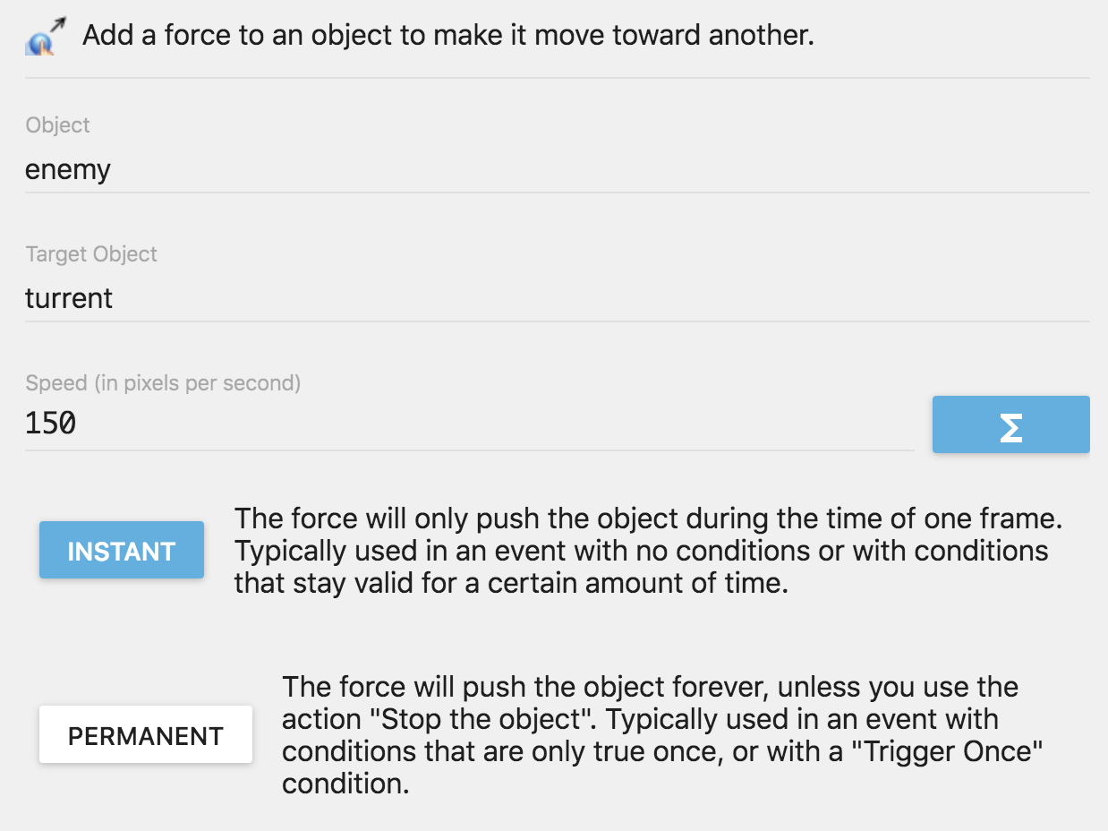 On the right side panel of the "Add a force to move toward an object", select "enemy" for the first parameter. Select "turret" for the second parameter. Enter 150 pixels per second for speed. Since the force will be applied at every single frame of the game (as there are no conditions), choose "Instant" for this force.