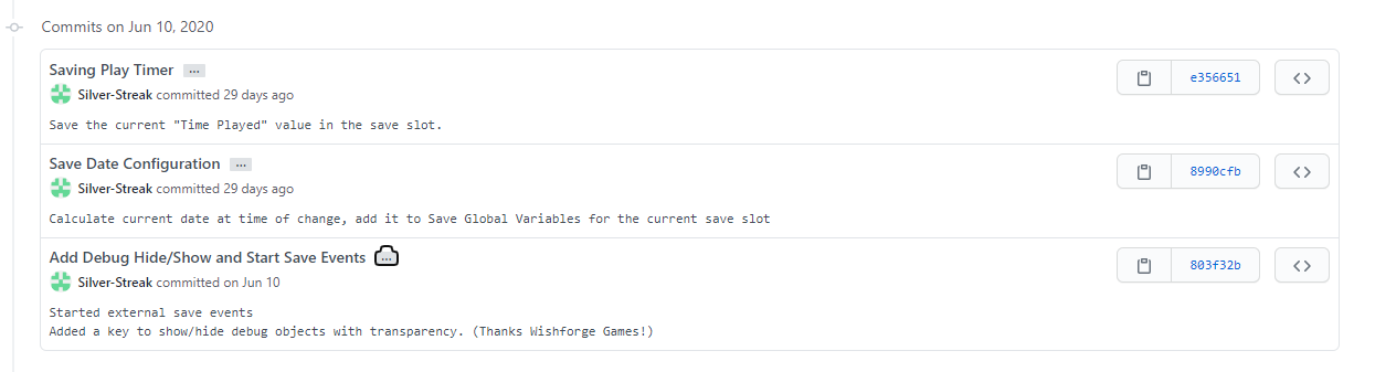- Going forward, new branches should be created as the game project moves on to each new feature or bugfix. Because Github allows for restoring the game code only to different commits, commits to branches should be completed frequently. Here are some examples of how frequently commits are completed in just one day, along with descriptions to easily identify what is changed: //