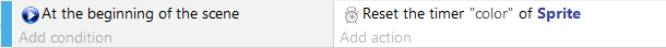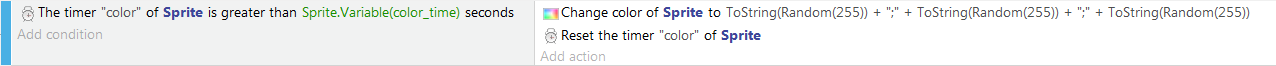 " よりも経過時間の大きいタイマー値を持つすべてのスプライトインスタンスが選択されます。それからスプライトの色をランダムな色に変更し、オブジェクトタイマーをリセットします。