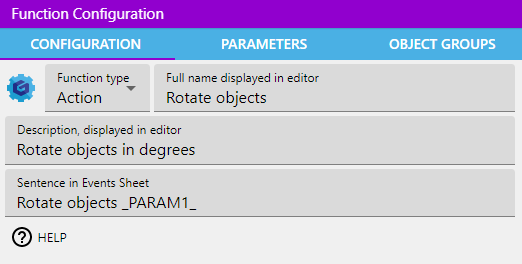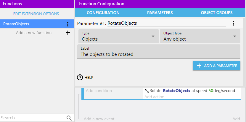 関数を登録するときに、条件、アクション、または式のいずれかを選択できます。この関数には、シーンや外部イベントと同じように、ゲーム中に条件またはアクションが起動されたときに実行されるイベントを含むことができます。