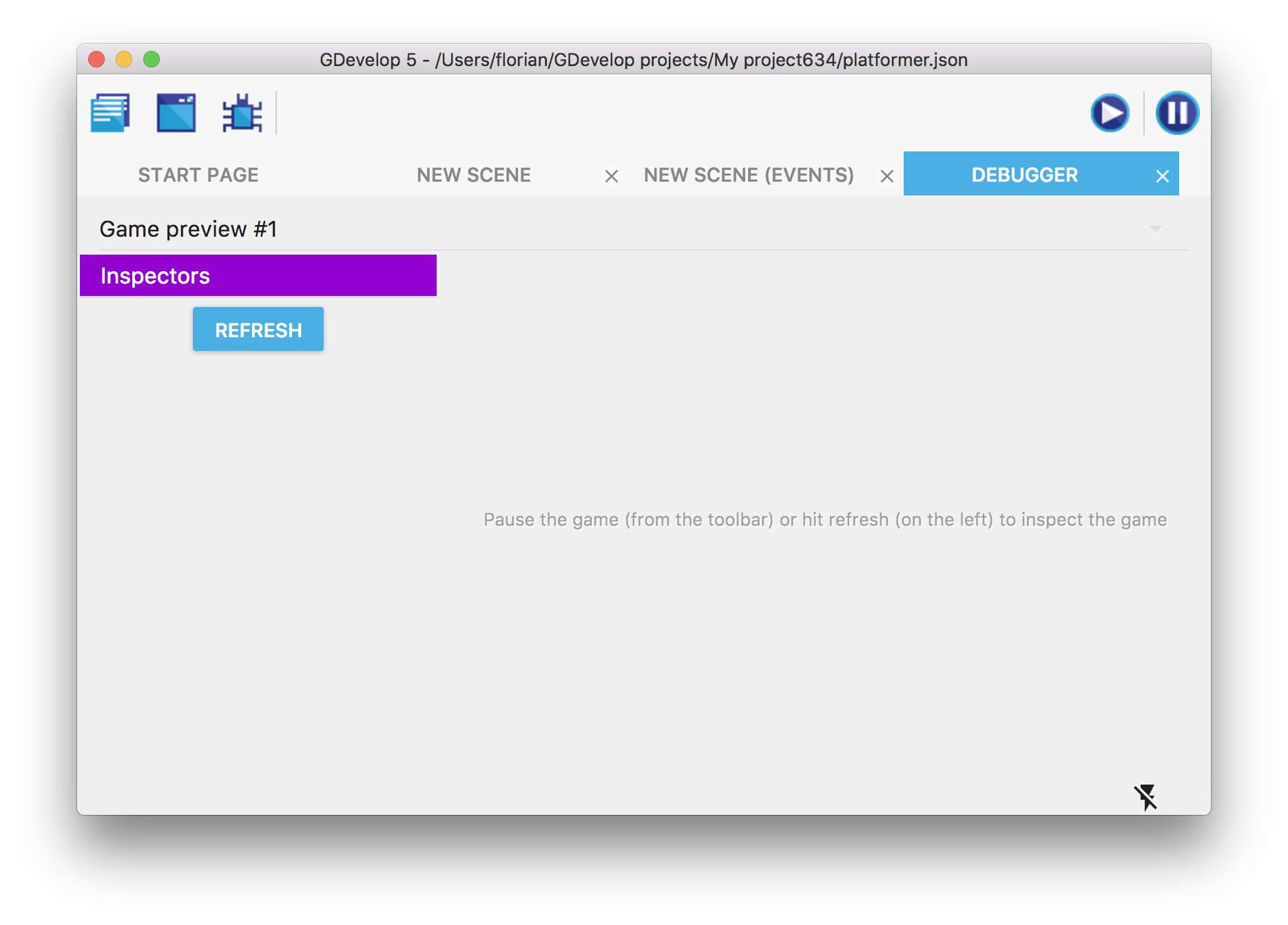 メニューで、「デバッガとパフォーマンスプロファイラーでプレビュー」を選択します。これにより、「デバッガ」という新しいタブが開き、通常どおりゲームのプレビューが起動します。