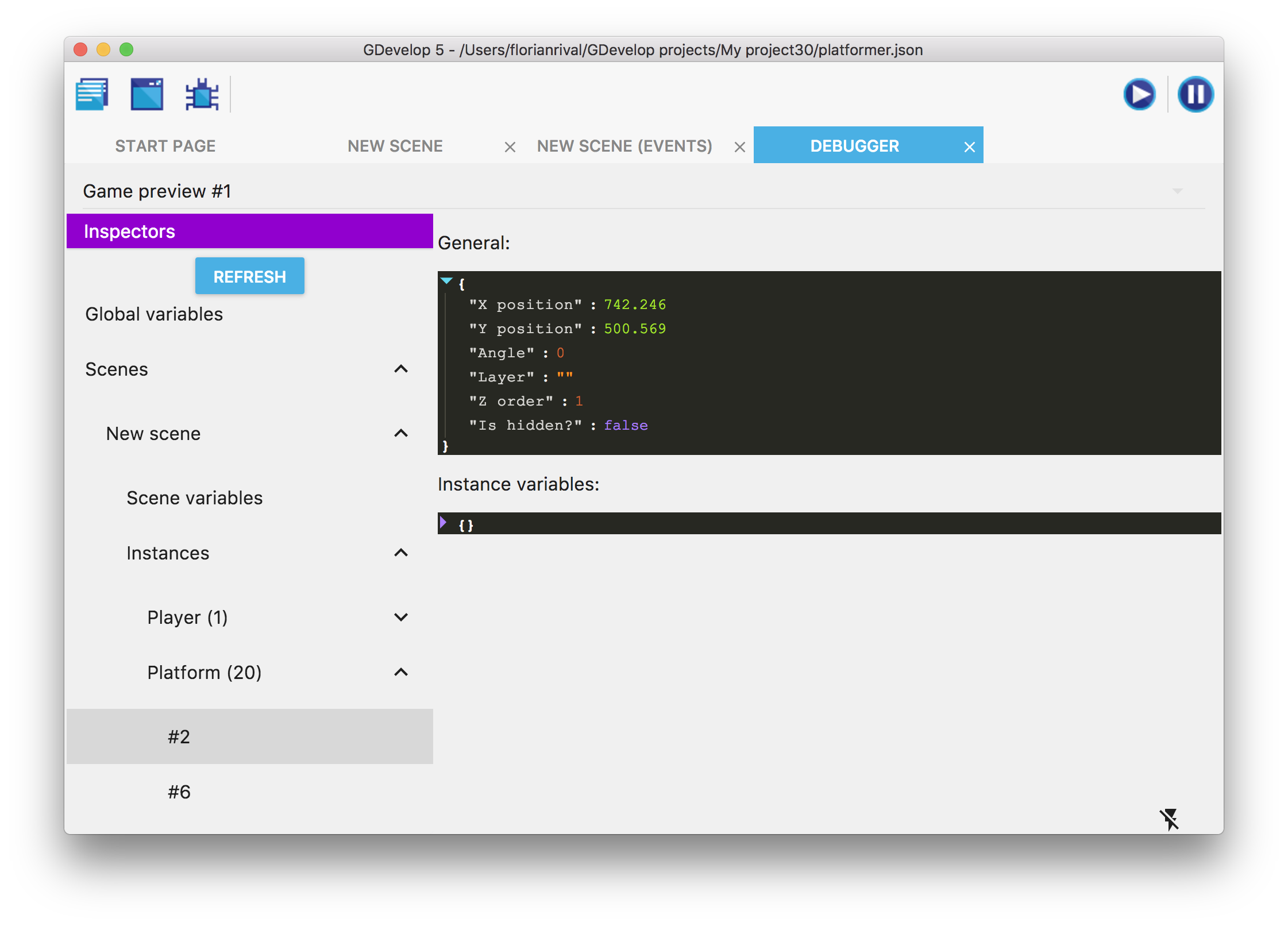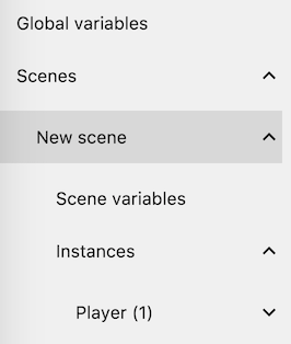 ゲーム全体の変数(グローバル変数)、シーンの変数(シーン変数)、またはオブジェクトの特定のインスタンス(インスタンス変数)を検査できます。
