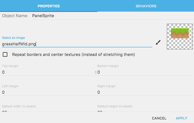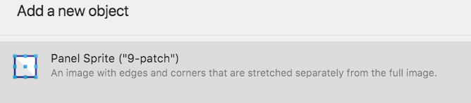 パネルスプライトオブジェクトを使用すると、境界線を繰り返したり、伸ばしたりしてテクスチャを表示できます。パネルスプライトオブジェクトは、動的なサイズのオブジェクトを作成するのに役立ちます。パネルスプライトオブジェクトの例には、インターフェイスのフレームなどが含まれます。プラットフォーム型ゲームでもこの機能を使用する場合があります。
