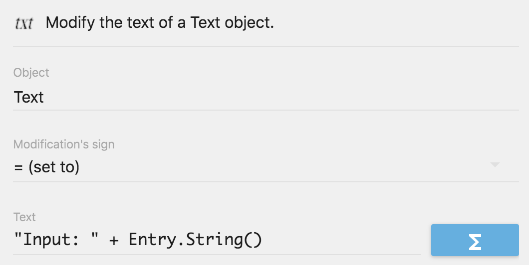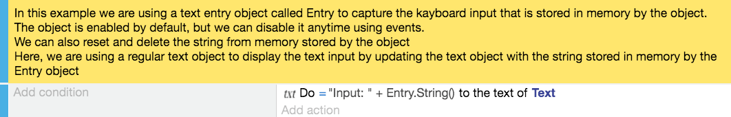 テキスト入力オブジェクトは、ユーザー入力をキャプチャしてメモリに保存します。このオブジェクトを使用して、テキスト入力フィールドをシミュレートできます。たとえば、テキストエントリオブジェクトを使用して、ゲームのプレイヤーが自分の名前やその他の情報を入力できる方法を提供できます。