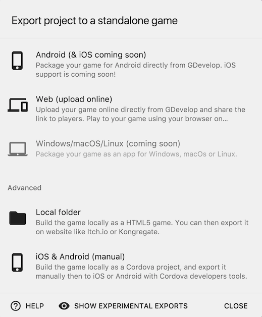GDevelopを使用すると、最新のプラットフォームにゲームを公開できます!、ゲームをまずエクスポートする必要があります。