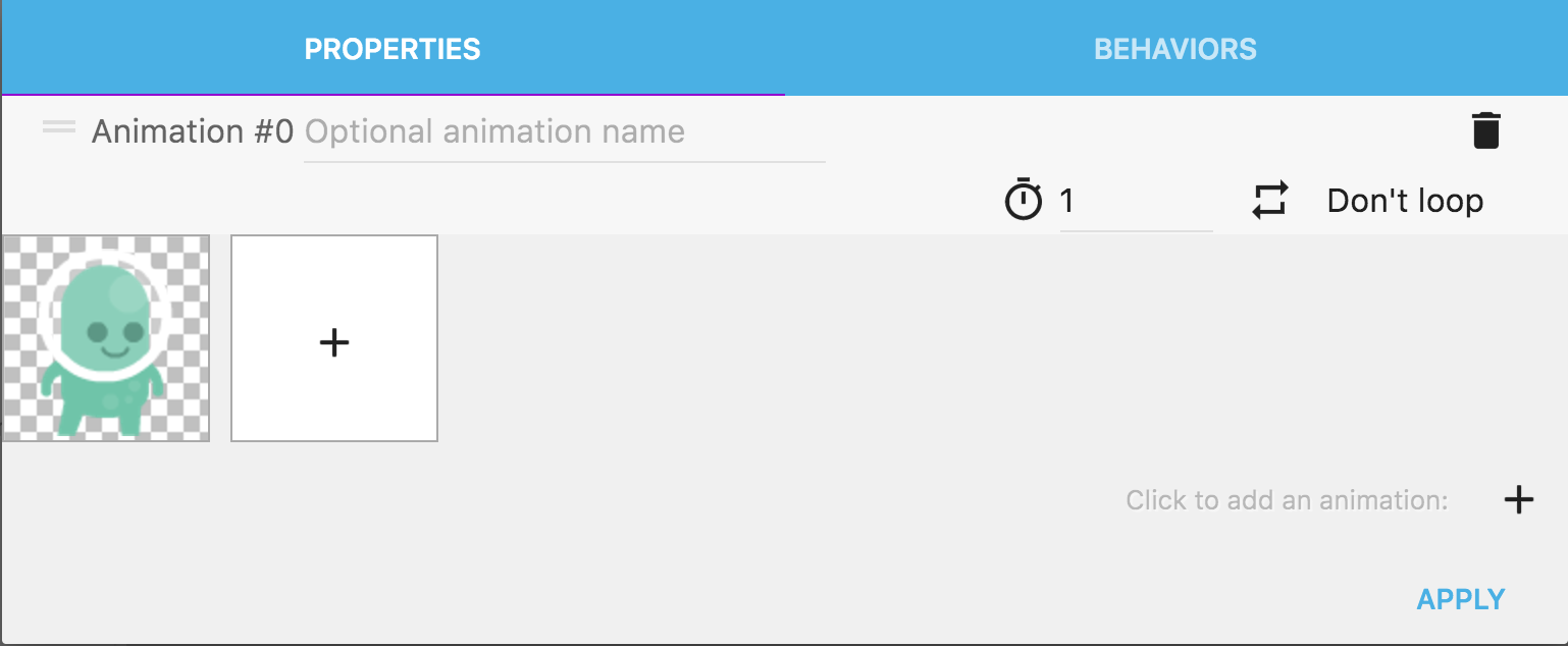 オブジェクトは今のところ空です。スプライトオブジェクトはアニメーションで構成され、各アニメーションには1つ以上の画像を含めることができます。アニメーションを追加しましょう!「+」ボタンをクリックします。