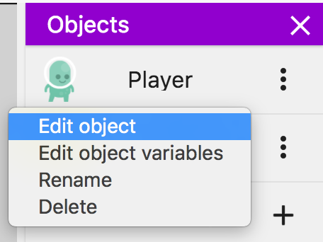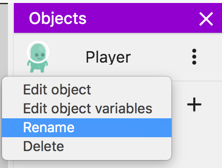 オブジェクトを参照しやすくするために、デフォルトの名前を使用するのではなく、名前を付けます。それを右クリック(または⋯アイコンをクリック)し、名前変更を選択します。次に、「Player」と入力して画面上の任意の場所をクリックするか、Enterキーを押してオブジェクトの名前を変更します。