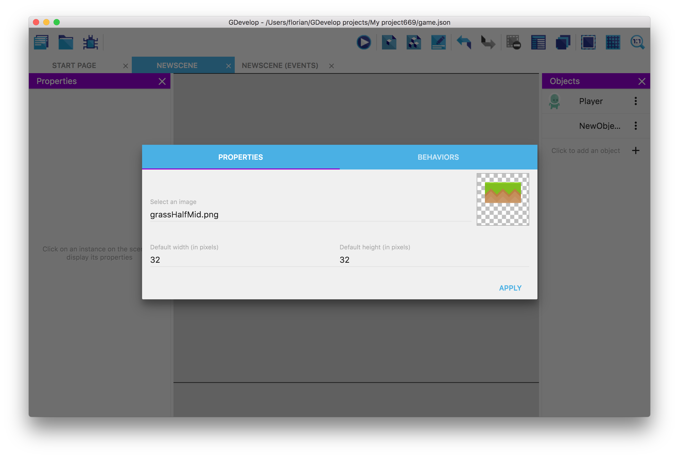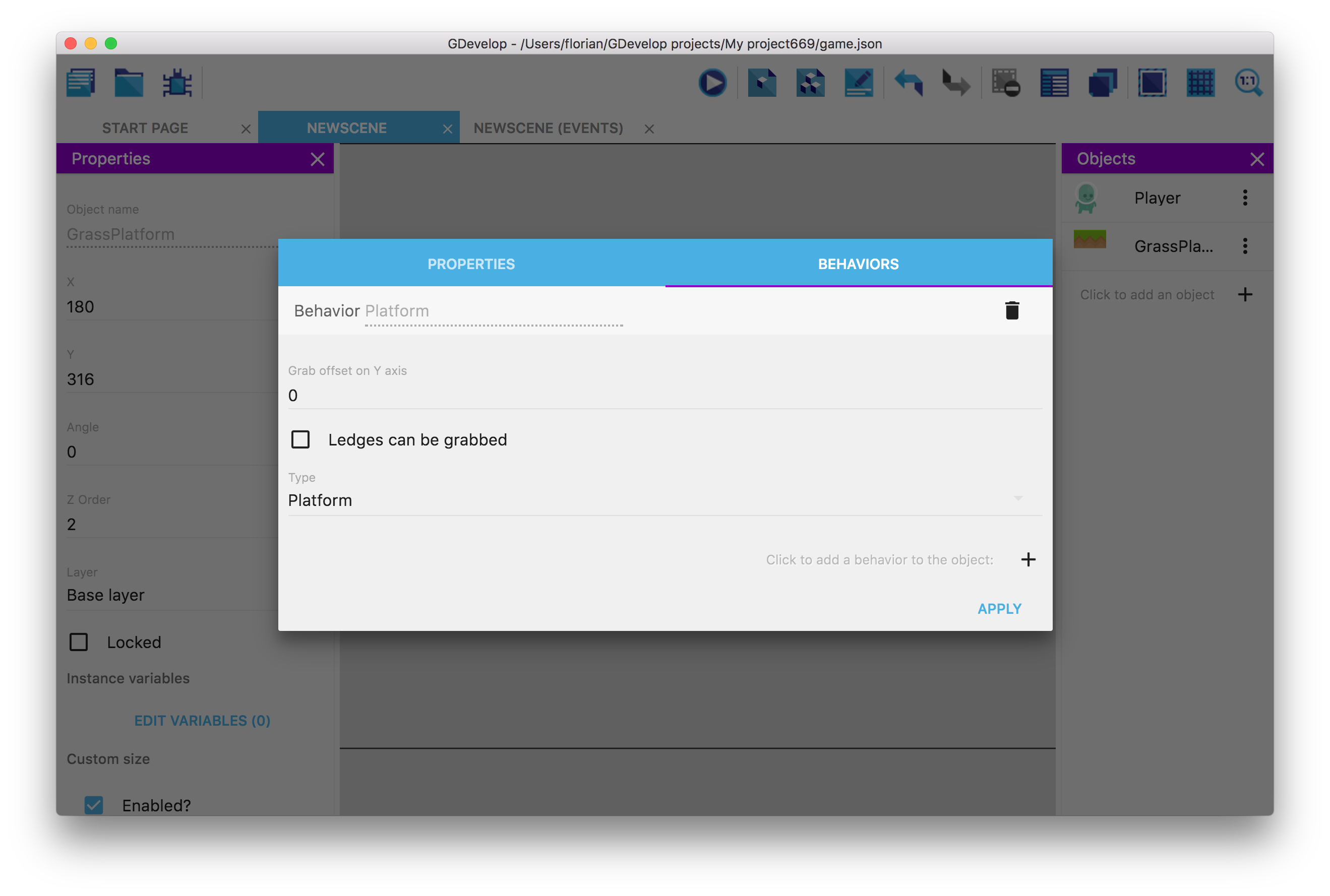 「草原ブロック」オブジェクトをプラットフォームに設定するには、「草原ブロック」のオブジェクトエディターを開きます。[ビヘイビア]タブに切り替えて、動作を追加します。今回は、Platformビヘイビアを選択します。.