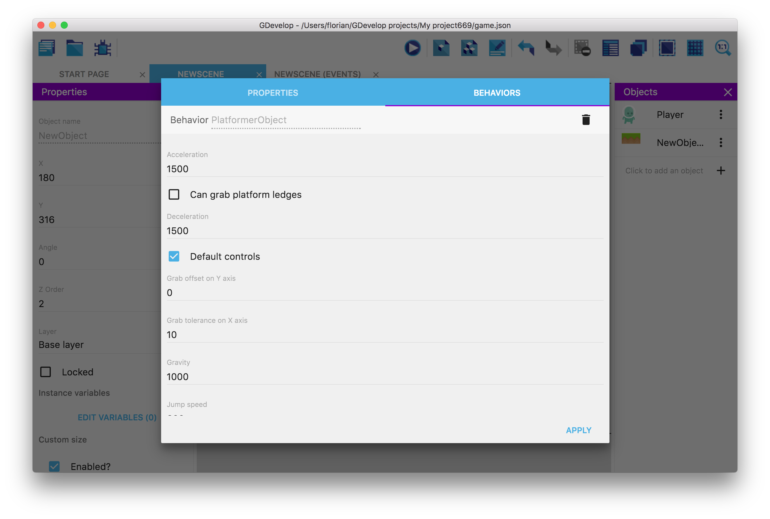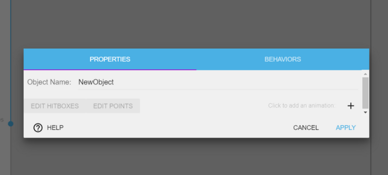 「ビヘイビア」タブに 切り替えて「+」ボタンをクリックし、オブジェクトに動作を追加します。利用可能なビヘイビアのリストから "Platformer character" を選択します。その後、エディターで動作を確認できます。多くのパラメーターを調整できます。