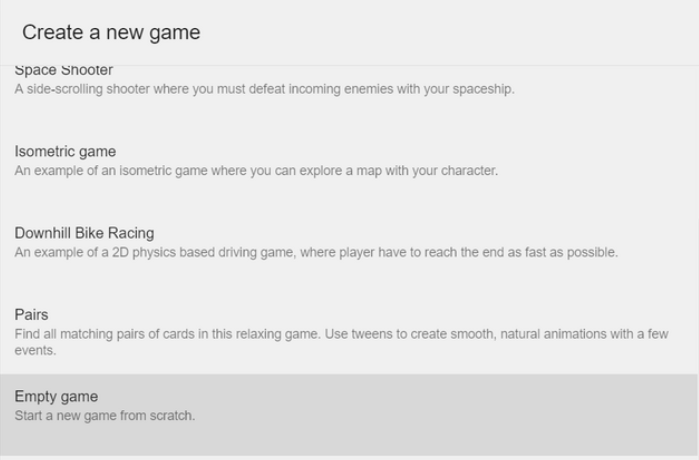スタートページで「新しいプロジェクトを作成」を クリックします。「空のプロジェクト」を選択し、新しいゲームを最初から開始します。