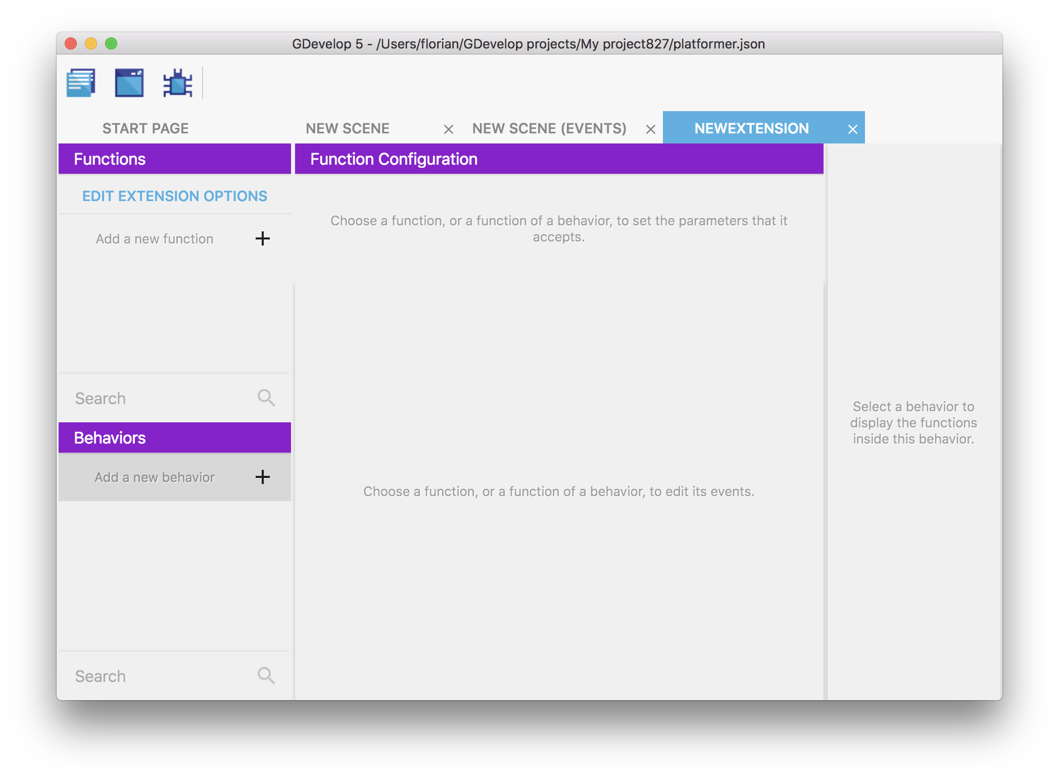 Clique na extensão da lista para abrir seu editor. Por padrão, não há funções nas extensões. Adicione uma clicando em Add a new behavior, no lado esquerdo: