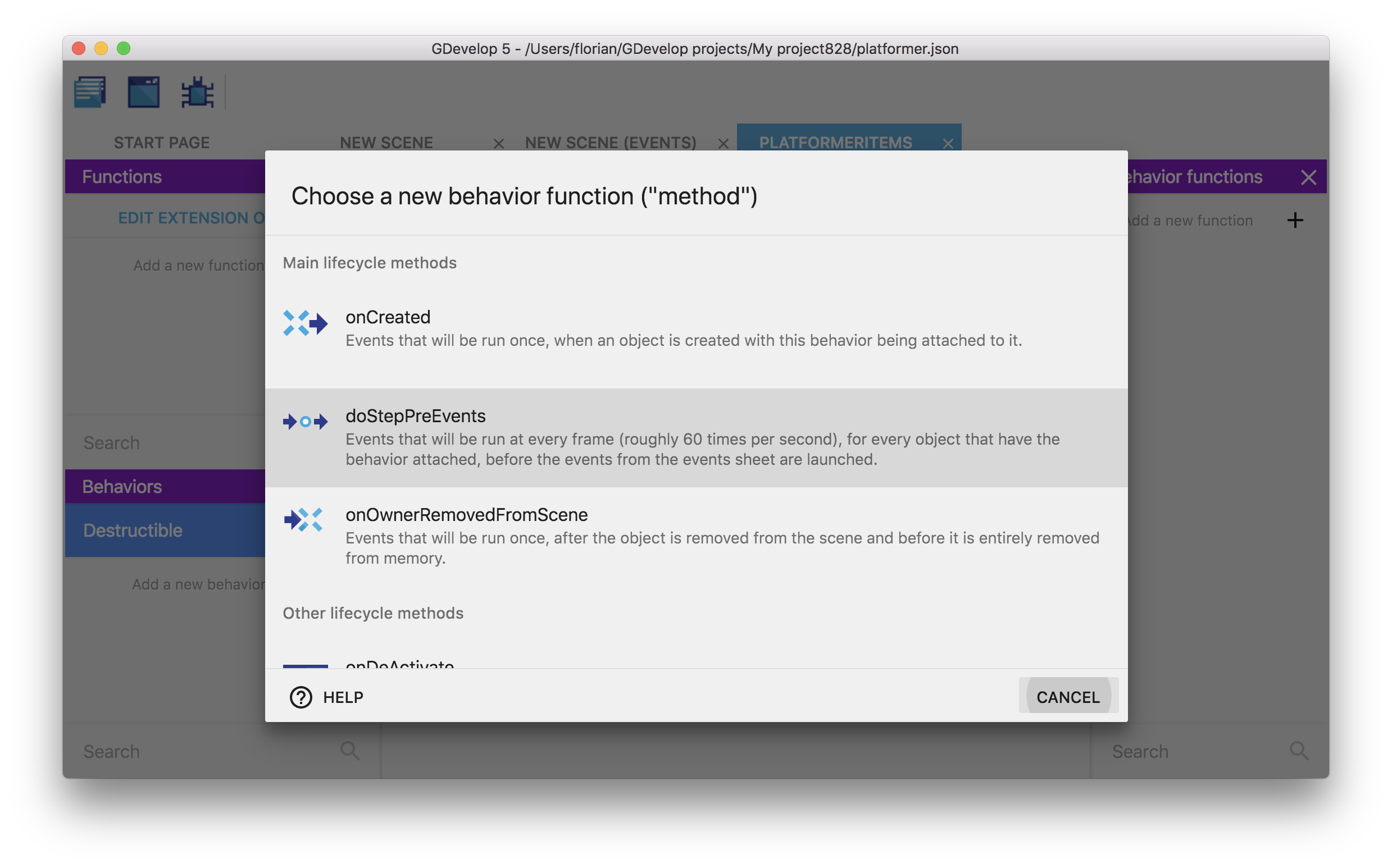 - onCreated: events inside the function will be run when a new instance of an object with the behavior is created. * onStepPreEvents: will be run every time a frame is rendering on the screen before the "traditional" events of the scene. Typically in most games, this is done 60 times per second. This is called for every single object having the behavior if the behavior is not deactivated. * onDestroy: events that will be run when an instance of the object having the behavior is deleted (if multiple objects are removed at the same time, events will be run for each object). This is done even if the behavior is deactivated. * onDeActivate: events that will be run once, after the behavior is deactivated on an object. * onActivate: events that will be run once, after the behavior is activated again on an object. * onStepPostEvents: events that will be run for every single object having the behavior, after the "traditional" events of the scene, if the behavior is not deactivated. Typically in most games, this is done 60 times per second. As possible, we recommend to prefer onStepPreEvents, to run your logic before events and give the events in the scene a chance to react to changes that happen on the objects.