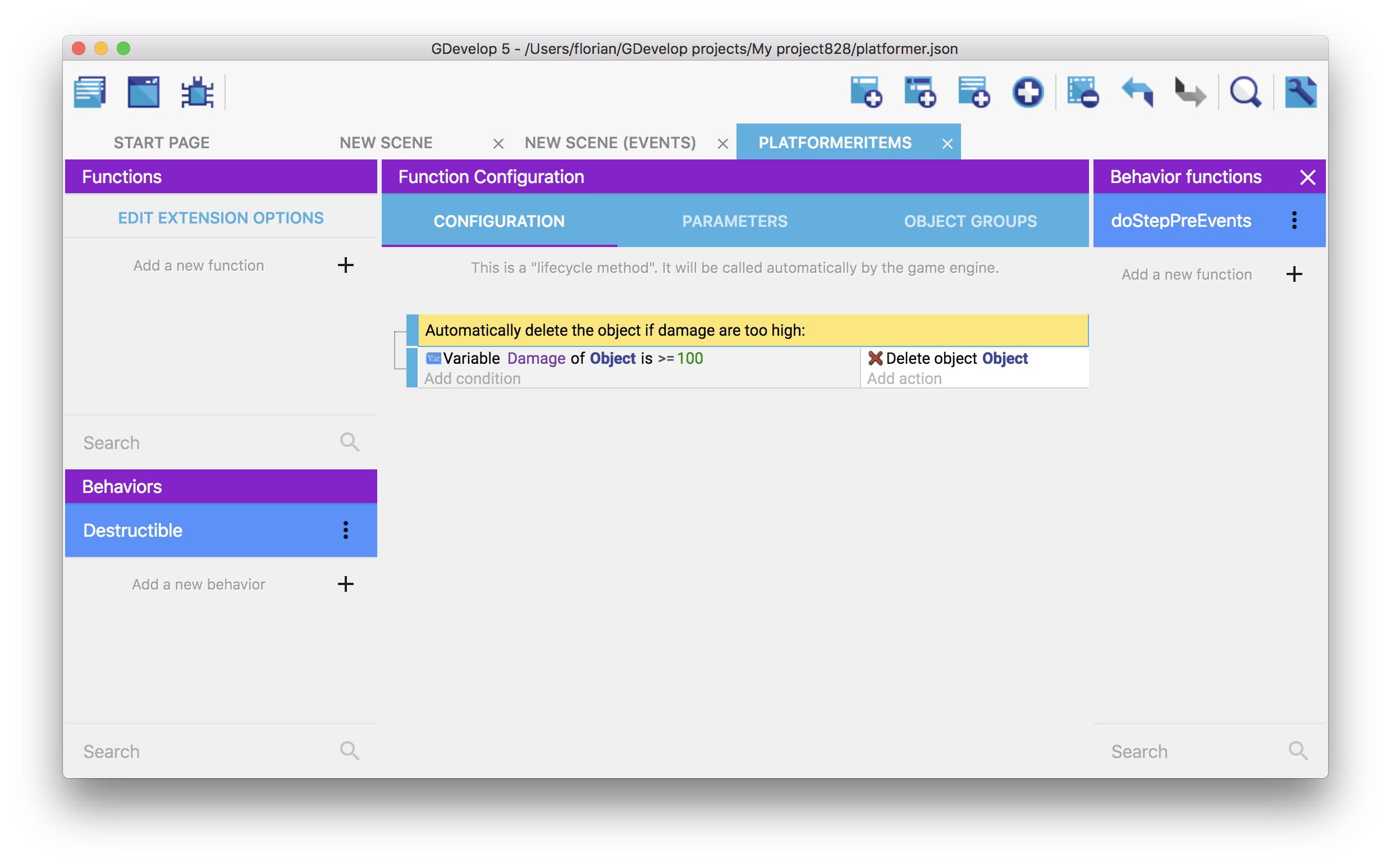 You can run the game and see that the events in "doStepPreEvents" function (or "doStepPostEvents") will be executed. In the example of the Destructible behavior that was created, if the "Damage" variable is set to a number greater or equal to 100, the object will be destroyed automatically.