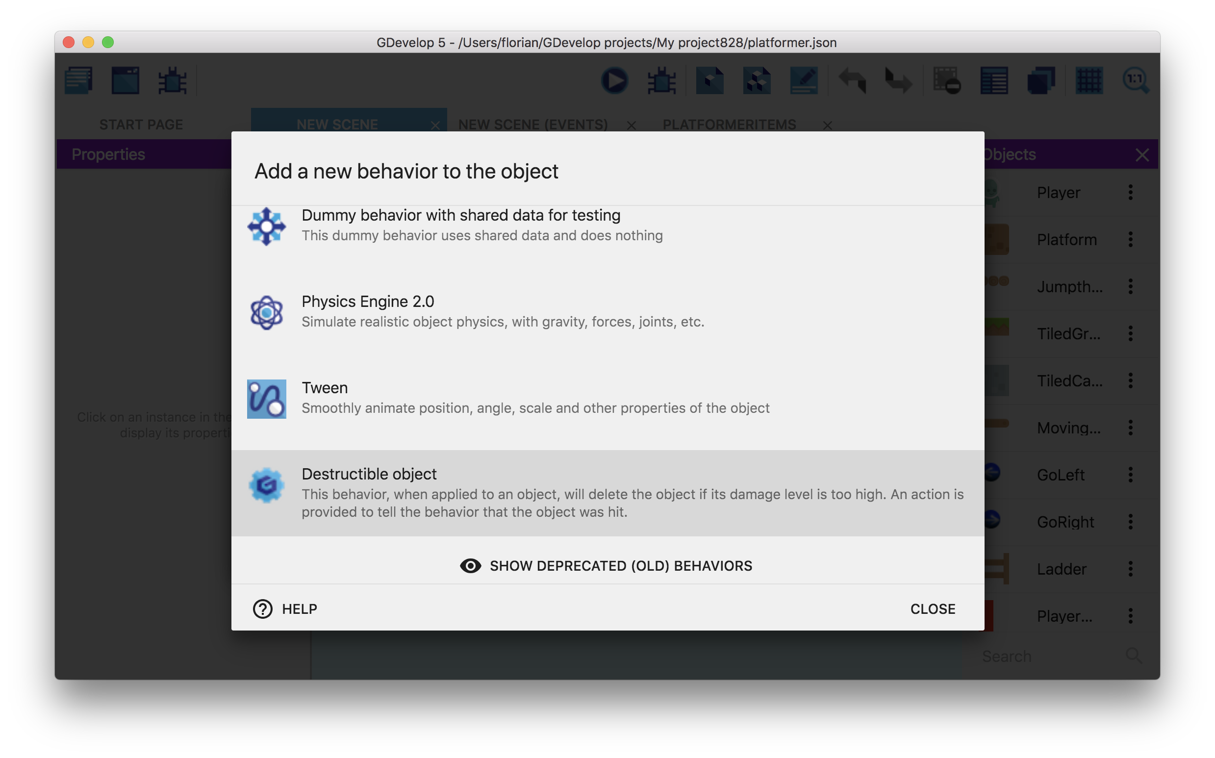 Here, you can see the "Destructible Object" behavior for example (that was created in the previous screenshots):