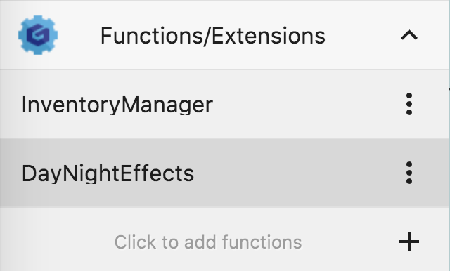 Os comportamentos são agrupados em "extensões". Eles funcionam de forma semelhante a extensions que você pode escrever para o GDevelop, exceto que eles são inteiramente compostos de funções ou comportamentos impulsionados por eventos. Você pode ver a lista de todas as extensões que o jogo tem no Project Manager, bem como adicionar uma nova extensão: