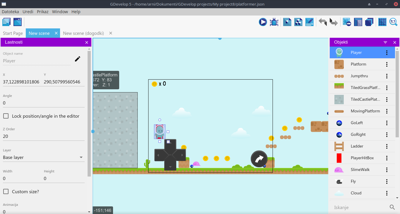 Meni na vrhu zaslona (le v namizni različici) omogoča odpiranje, shranjevanje in [gdevelop5:publishing|objavo igre]].