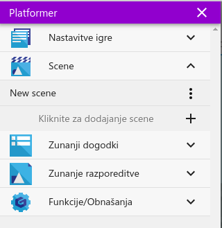 Ko odprete sceno (ali zunanjo postavitev), se odpre scenski urejevalnik. Tukaj lahko oblikujete in gradite nivoje svoje igre in meniju z ustvarjanjem in dodajanjem objektov v sceno.
